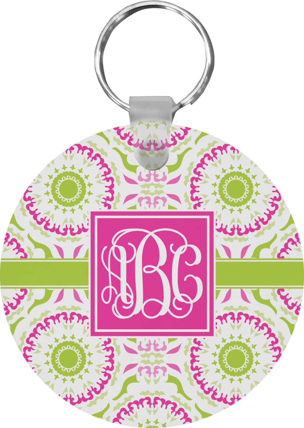This design has a beautiful suzani floral pattern for the background. The colors in the background are white, hot pink, and lime green. These colors look super cute together. There is a lime green ribbon with a hot pink frame on top. Inside the frame is where your personalization goes. Put text or your initials for a monogram.
