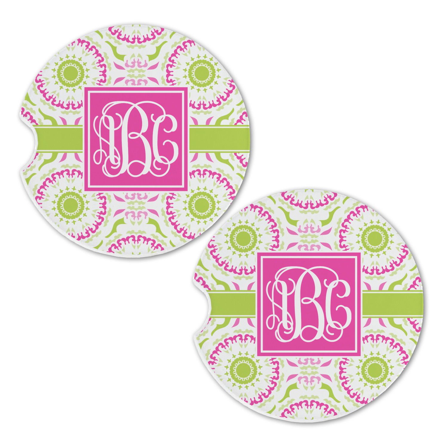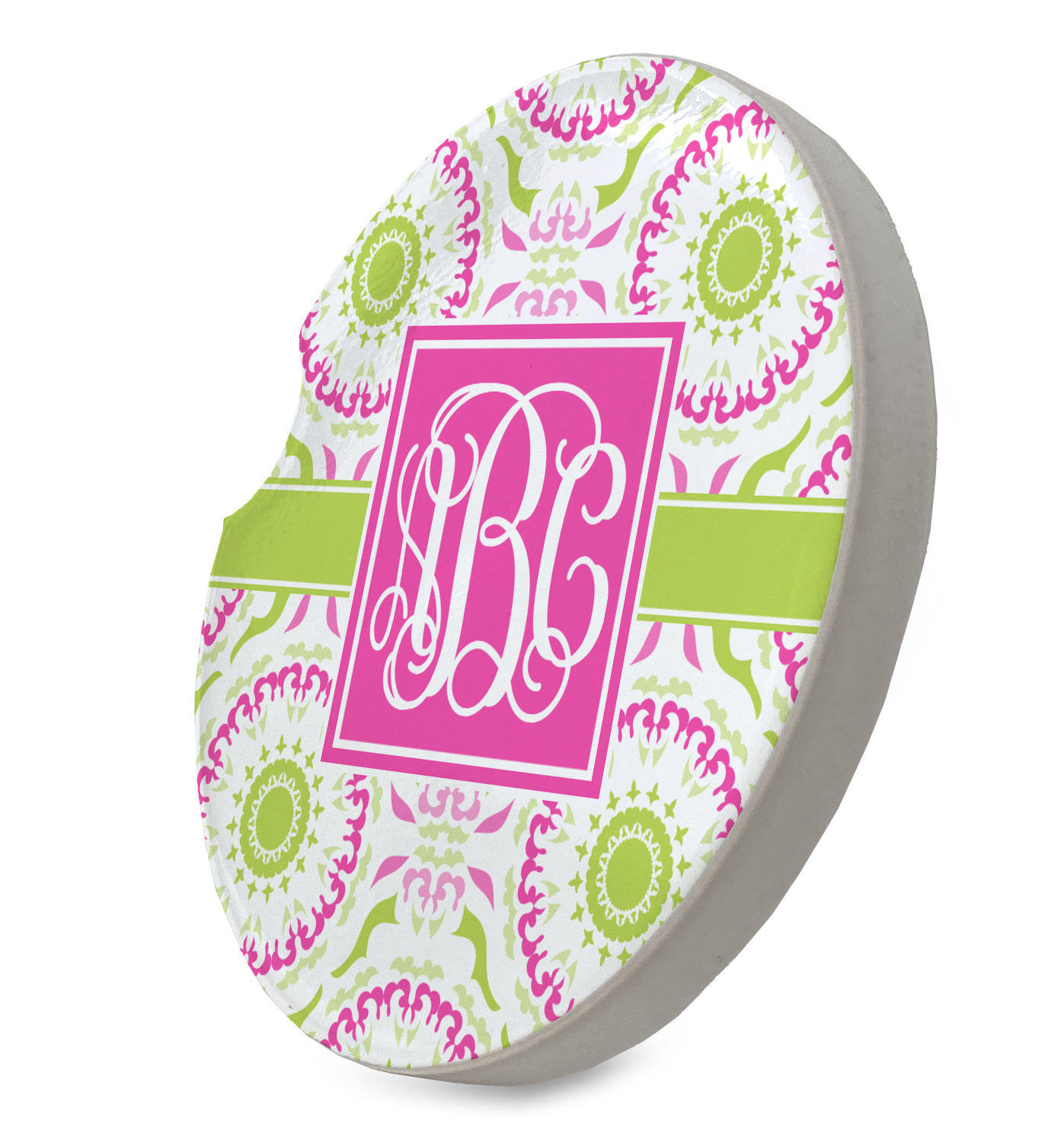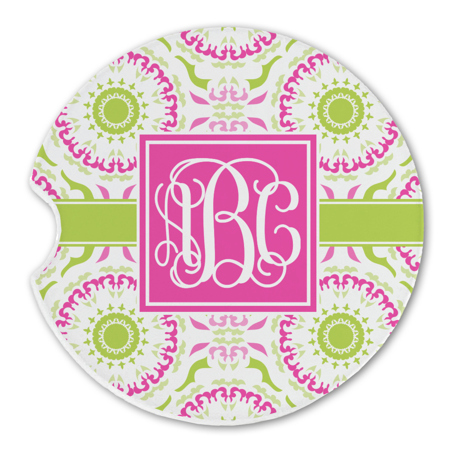 This design has a beautiful suzani floral pattern for the background. The colors in the background are white, hot pink, and lime green. These colors look super cute together. There is a lime green ribbon with a hot pink frame on top. Inside the frame is where your personalization goes. Put text or your initials for a monogram.