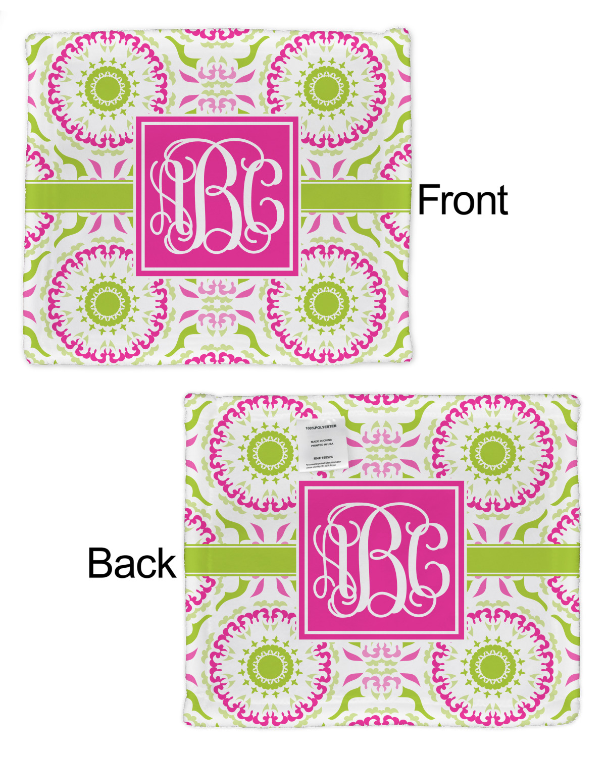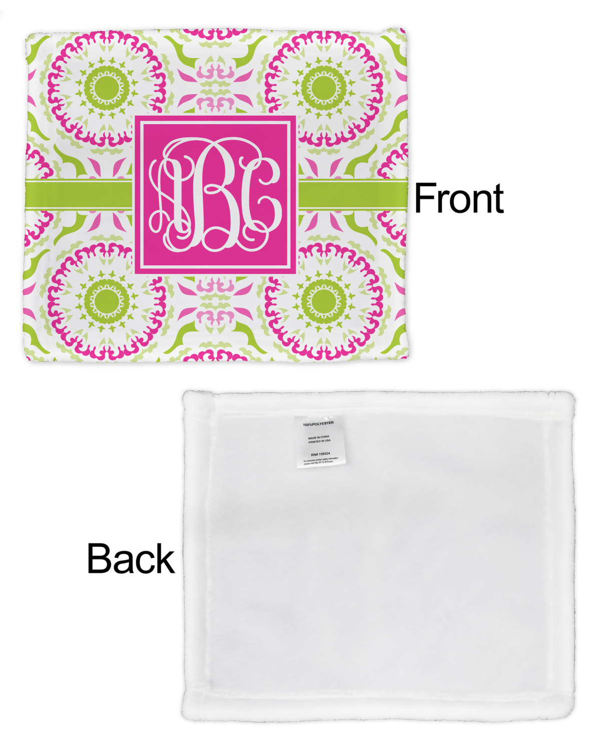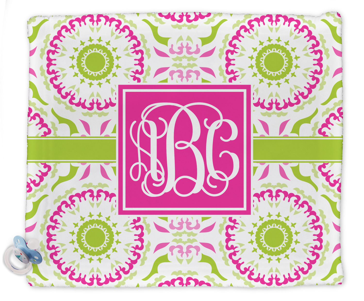 This design has a beautiful suzani floral pattern for the background. The colors in the background are white, hot pink, and lime green. These colors look super cute together. There is a lime green ribbon with a hot pink frame on top. Inside the frame is where your personalization goes. Put text or your initials for a monogram.