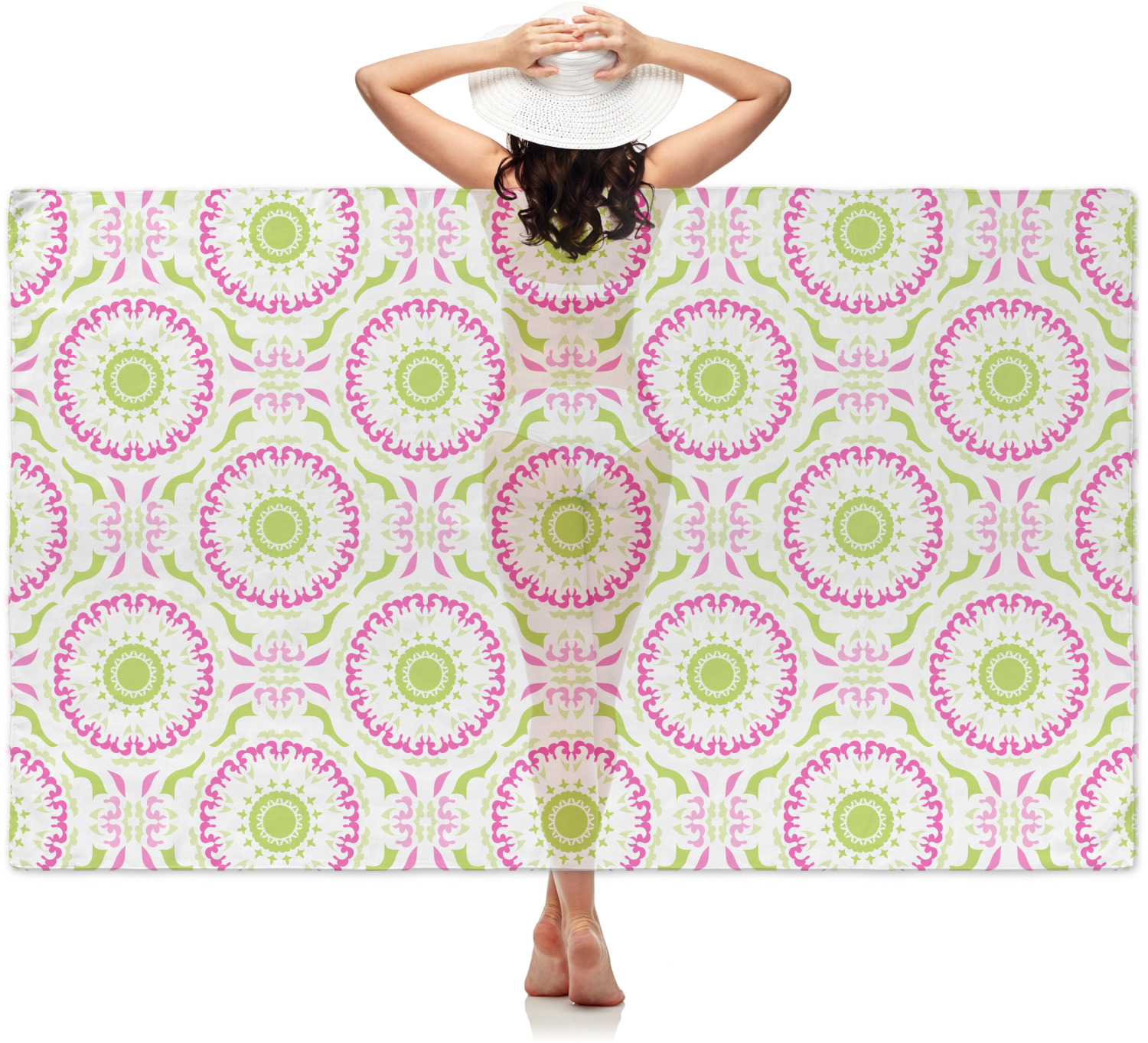 This sarong is 42" x 70" of personalized beauty. It is made of a soft polyester for comfort when against your skin. The material is sheer, so it serves well as a swimsuit cover-up or a shawl. There are so many uses for this wonderful product that you will be sure to find when it is in your hands.