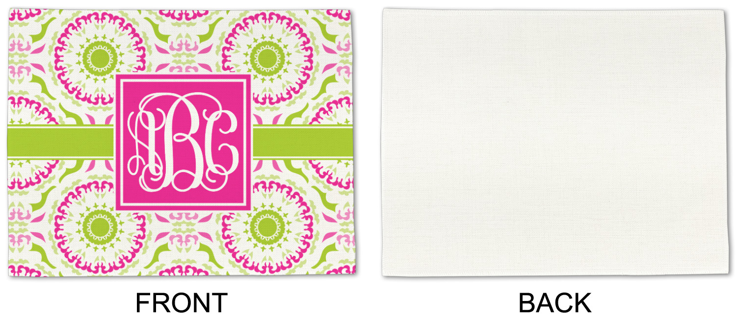 This design has a beautiful suzani floral pattern for the background. The colors in the background are white, hot pink, and lime green. These colors look super cute together. There is a lime green ribbon with a hot pink frame on top. Inside the frame is where your personalization goes. Put text or your initials for a monogram.