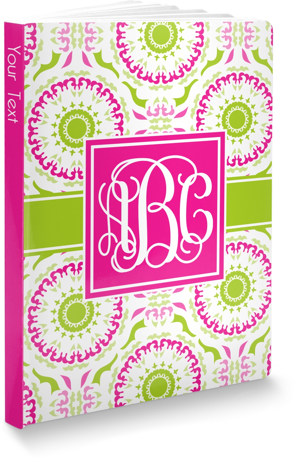 This design has a beautiful suzani floral pattern for the background. The colors in the background are white, hot pink, and lime green. These colors look super cute together. There is a lime green ribbon with a hot pink frame on top. Inside the frame is where your personalization goes. Put text or your initials for a monogram.