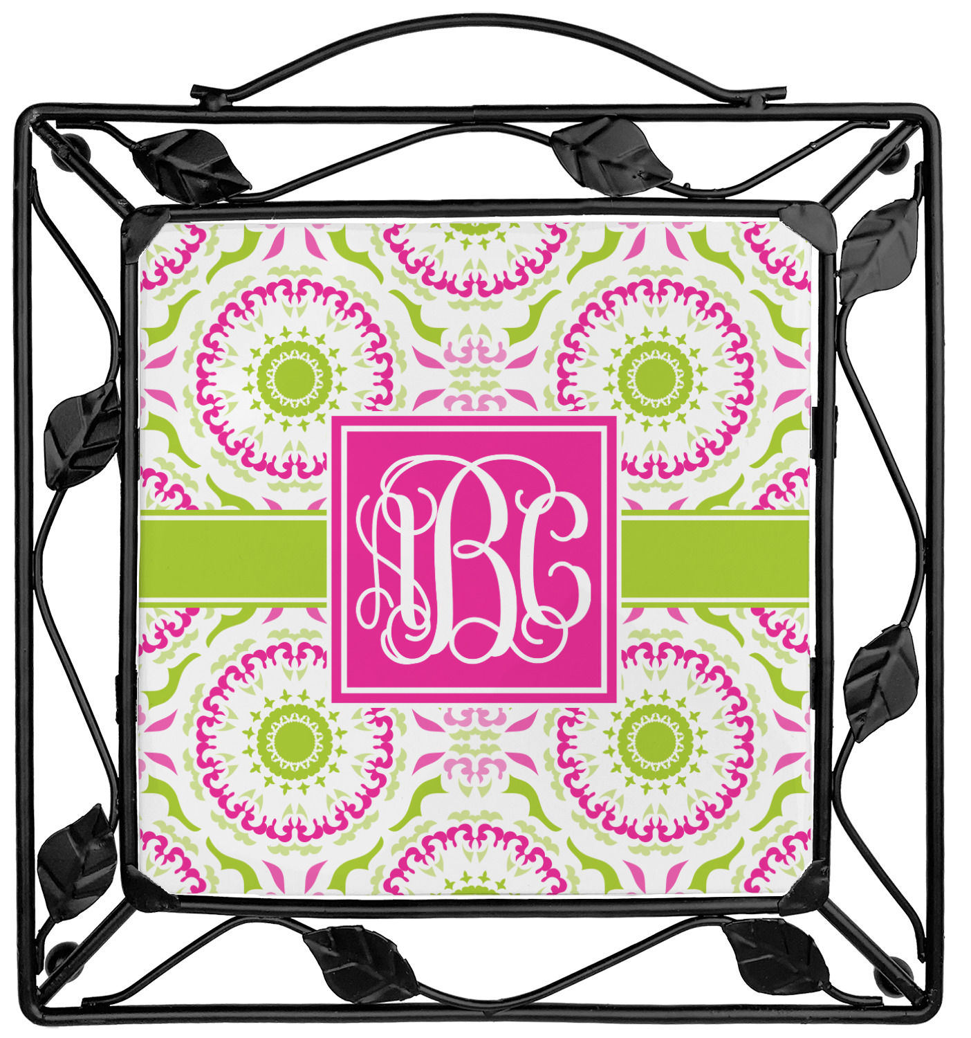 Our square trivets are made from a durable, wrought iron. This model features 4 small half circles, one on each corner, and a larger ring of iron that circles the central, customized tile. Each of the 4 corners has a round foot on its bottom for stability. This trivet is 8.75 by 8.75 inches, but the central tile measures at 6 inches on both sides.