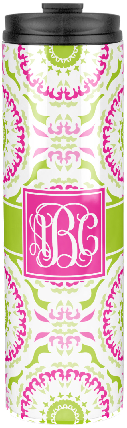 This design has a beautiful suzani floral pattern for the background. The colors in the background are white, hot pink, and lime green. These colors look super cute together. There is a lime green ribbon with a hot pink frame on top. Inside the frame is where your personalization goes. Put text or your initials for a monogram.
