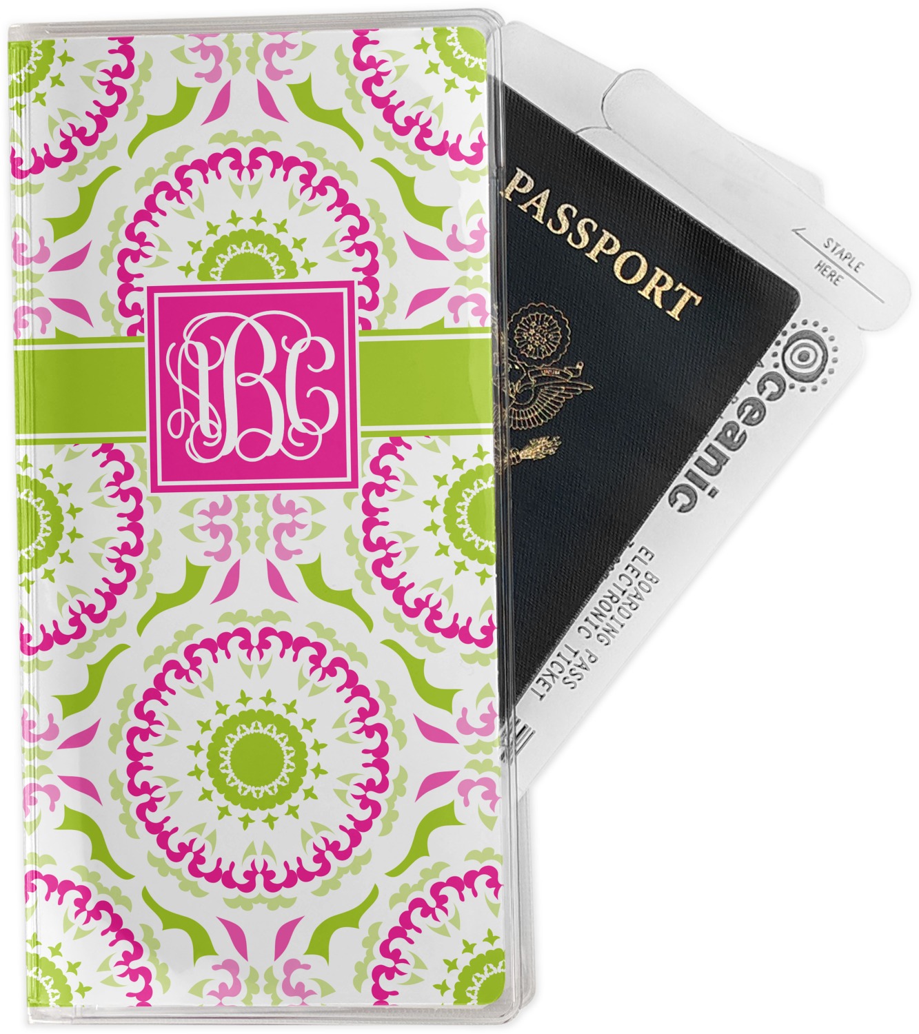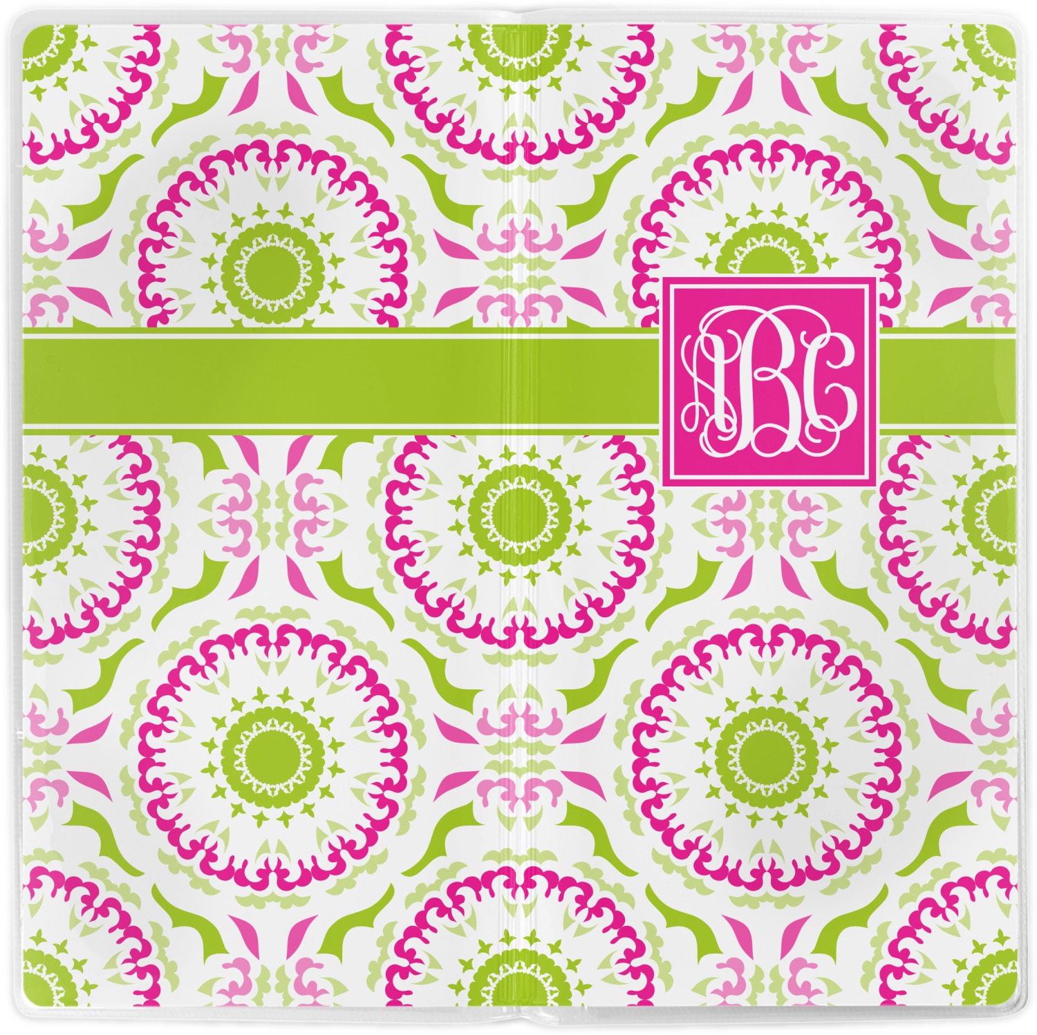 This design has a beautiful suzani floral pattern for the background. The colors in the background are white, hot pink, and lime green. These colors look super cute together. There is a lime green ribbon with a hot pink frame on top. Inside the frame is where your personalization goes. Put text or your initials for a monogram.