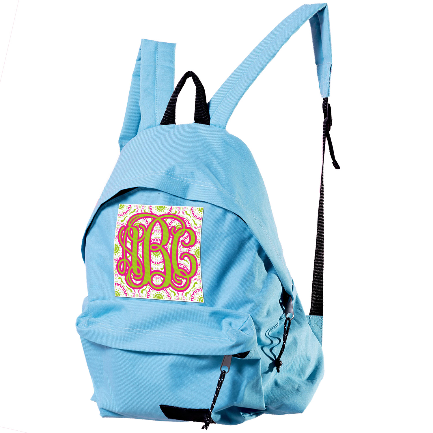This design has a beautiful suzani floral pattern for the background. The colors in the background are white, hot pink, and lime green. These colors look super cute together. There is a lime green ribbon with a hot pink frame on top. Inside the frame is where your personalization goes. Put text or your initials for a monogram.