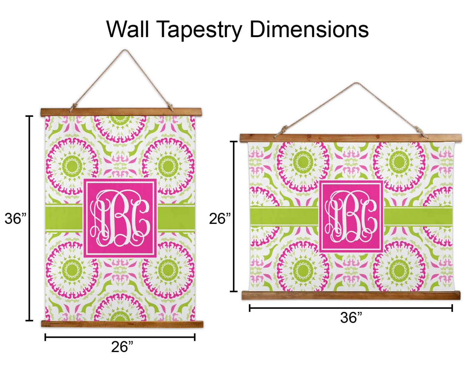 Made in two different orientations - portrait or landscape - both are 26" x 36". Your design is printed on a high quality polyester fabric with hemmed edges. The wood on the top and bottom of the tapestry is 1.25" tall and 0.25" thick and there are two pieces on top and bottom which sandwich the fabric.