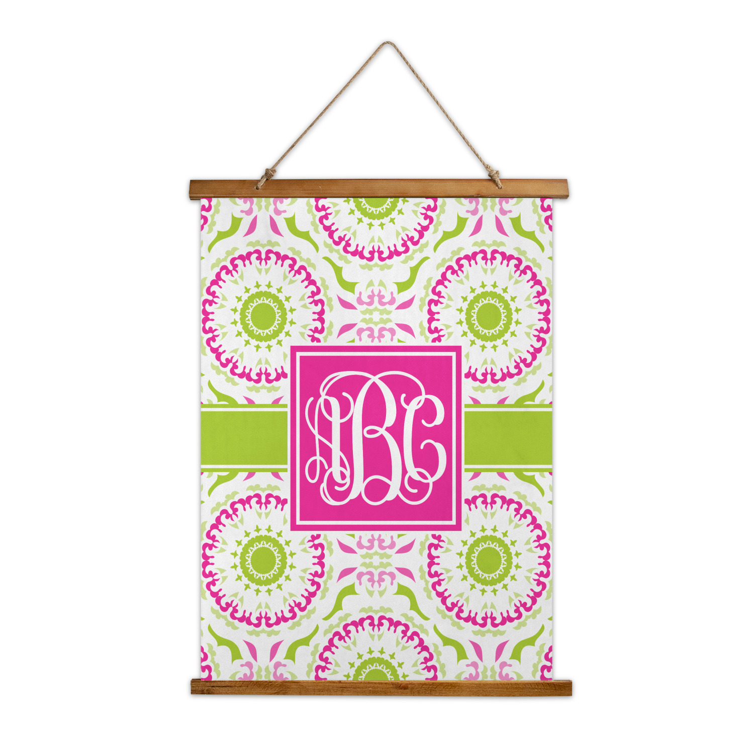 This design has a beautiful suzani floral pattern for the background. The colors in the background are white, hot pink, and lime green. These colors look super cute together. There is a lime green ribbon with a hot pink frame on top. Inside the frame is where your personalization goes. Put text or your initials for a monogram.