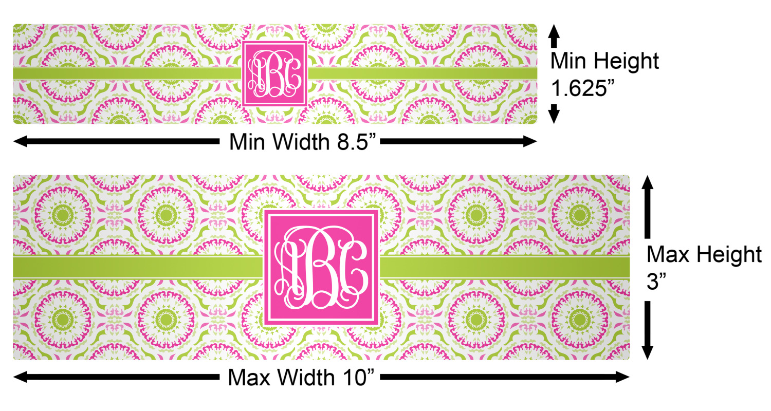 This design has a beautiful suzani floral pattern for the background. The colors in the background are white, hot pink, and lime green. These colors look super cute together. There is a lime green ribbon with a hot pink frame on top. Inside the frame is where your personalization goes. Put text or your initials for a monogram.
