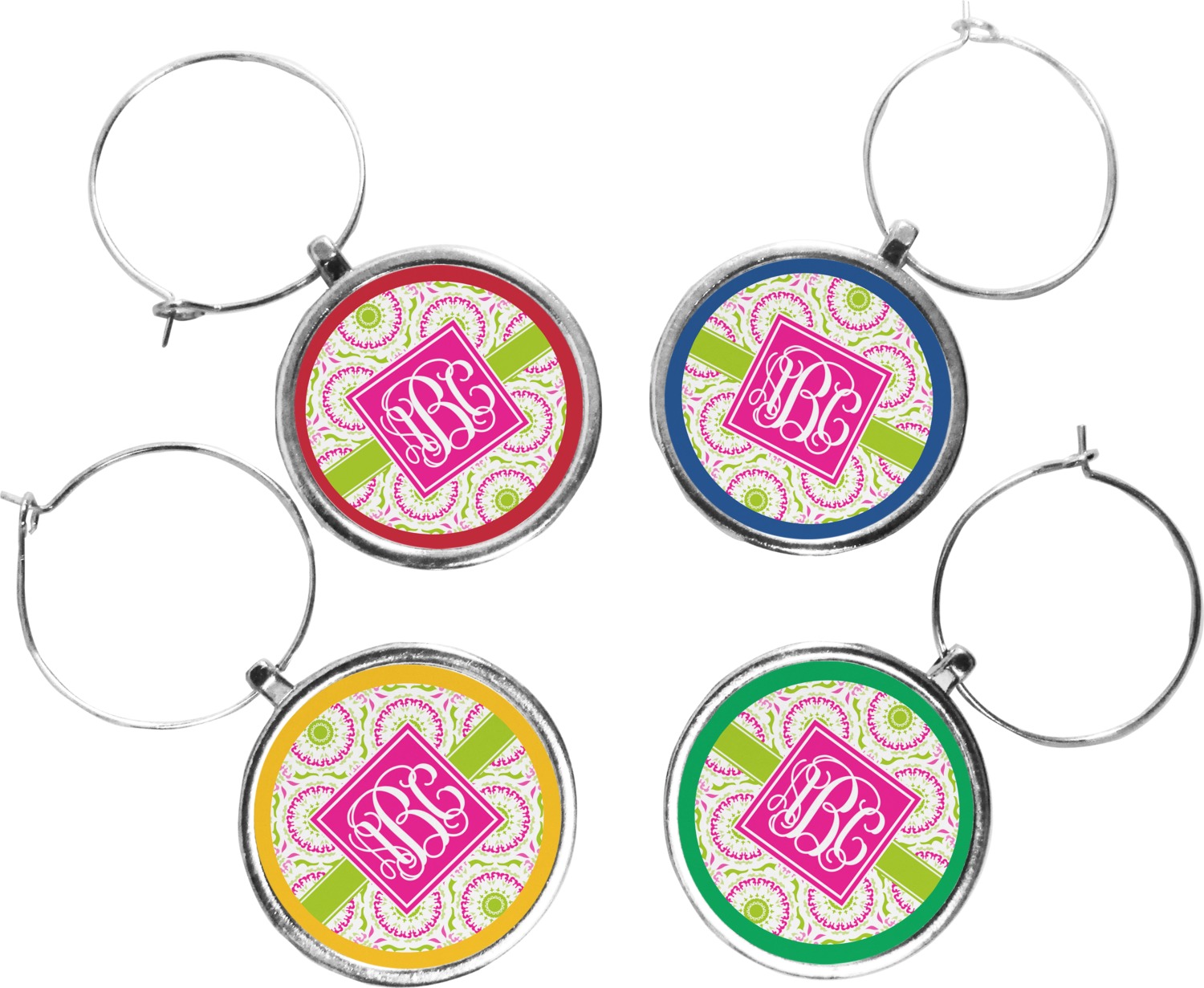 Your wine glass markers are comprised of a circular zinc plate with a 1.25 inch diameter. The zinc plate hangs from a zinc loop, which can be easily secured and removed from the stem of a wine glass. Your customized design is printed onto a 1 inch diameter insert, and then placed into the wine glass charm itself. Though sold in a set of four, you can personalize each charm individually and change the colors of the ring around your design, depending on your needs.