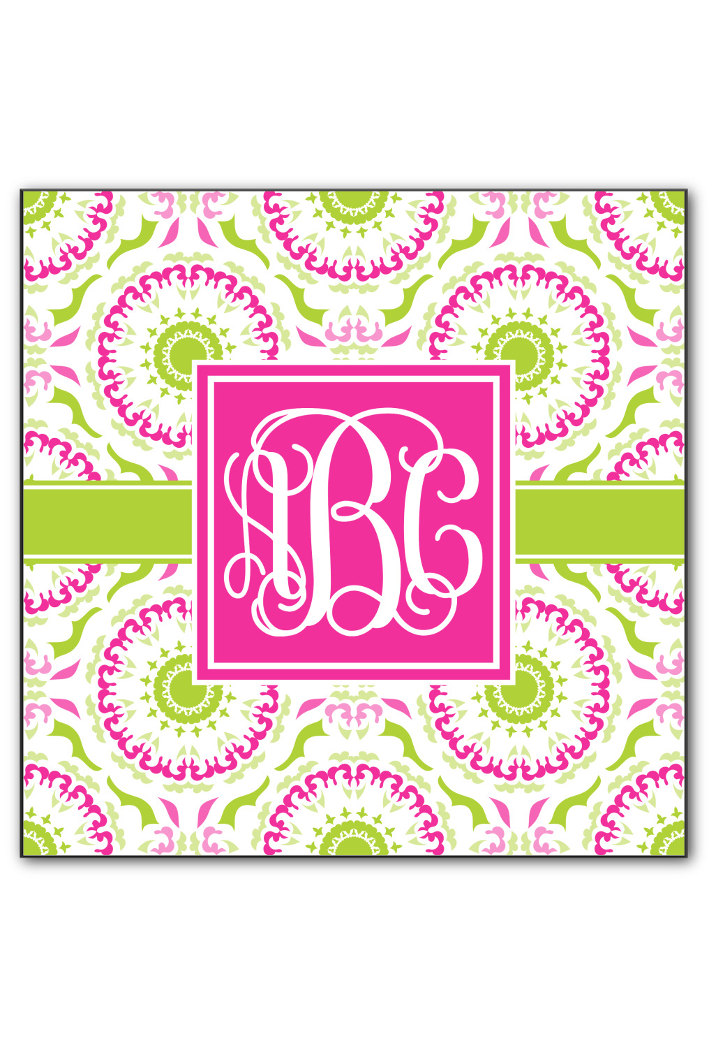 This design has a beautiful suzani floral pattern for the background. The colors in the background are white, hot pink, and lime green. These colors look super cute together. There is a lime green ribbon with a hot pink frame on top. Inside the frame is where your personalization goes. Put text or your initials for a monogram.