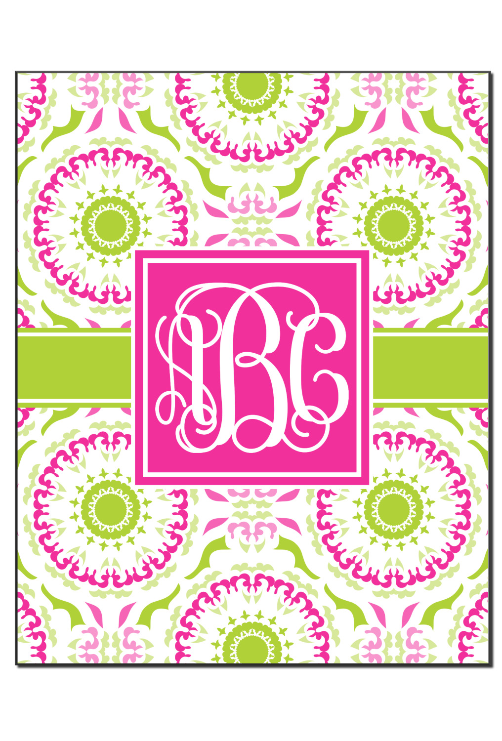 This design has a beautiful suzani floral pattern for the background. The colors in the background are white, hot pink, and lime green. These colors look super cute together. There is a lime green ribbon with a hot pink frame on top. Inside the frame is where your personalization goes. Put text or your initials for a monogram.