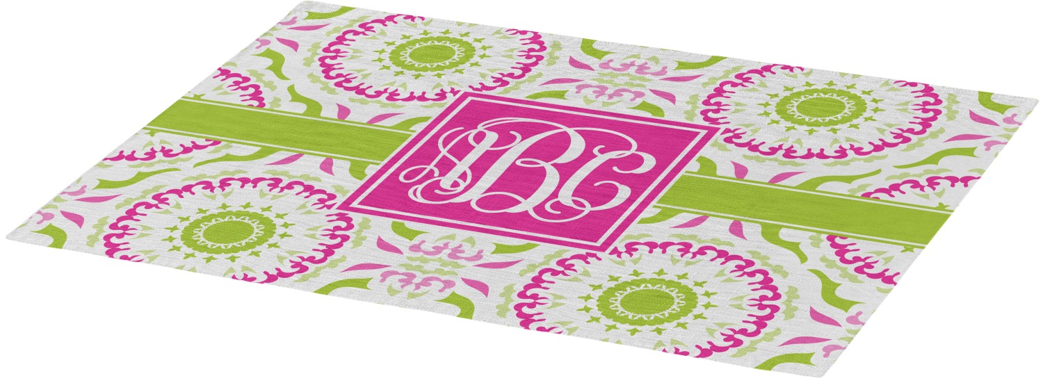 This design has a beautiful suzani floral pattern for the background. The colors in the background are white, hot pink, and lime green. These colors look super cute together. There is a lime green ribbon with a hot pink frame on top. Inside the frame is where your personalization goes. Put text or your initials for a monogram.