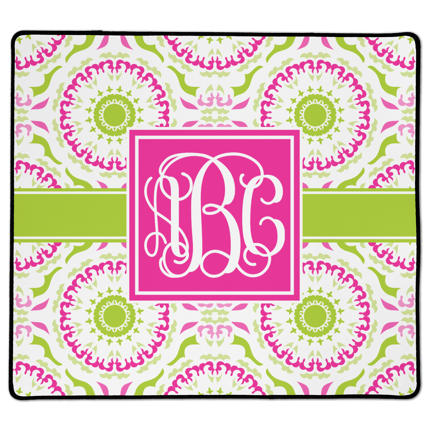 This design has a beautiful suzani floral pattern for the background. The colors in the background are white, hot pink, and lime green. These colors look super cute together. There is a lime green ribbon with a hot pink frame on top. Inside the frame is where your personalization goes. Put text or your initials for a monogram.