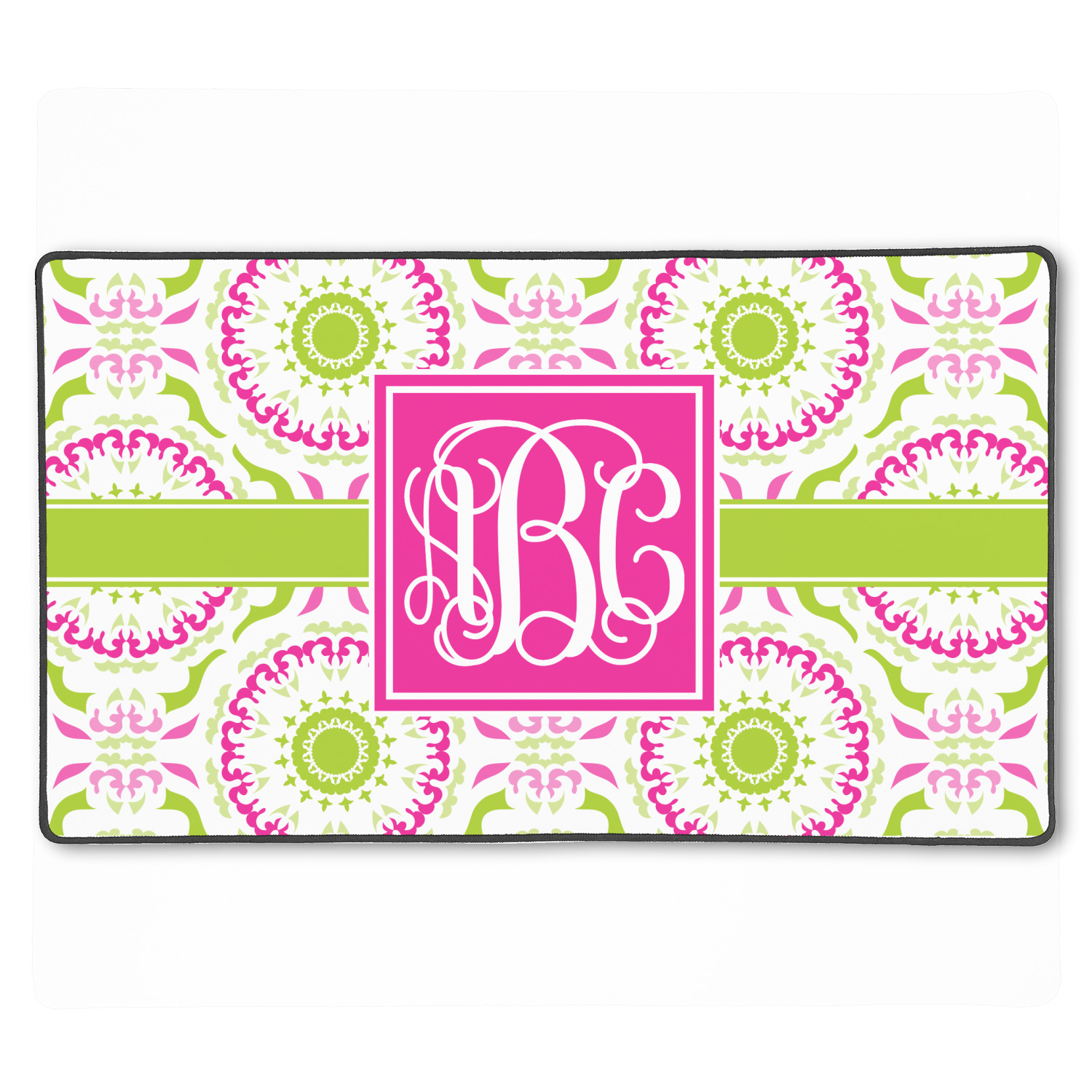 This design has a beautiful suzani floral pattern for the background. The colors in the background are white, hot pink, and lime green. These colors look super cute together. There is a lime green ribbon with a hot pink frame on top. Inside the frame is where your personalization goes. Put text or your initials for a monogram.