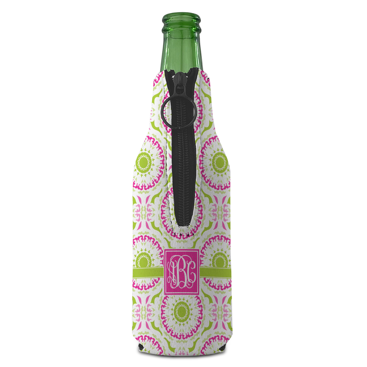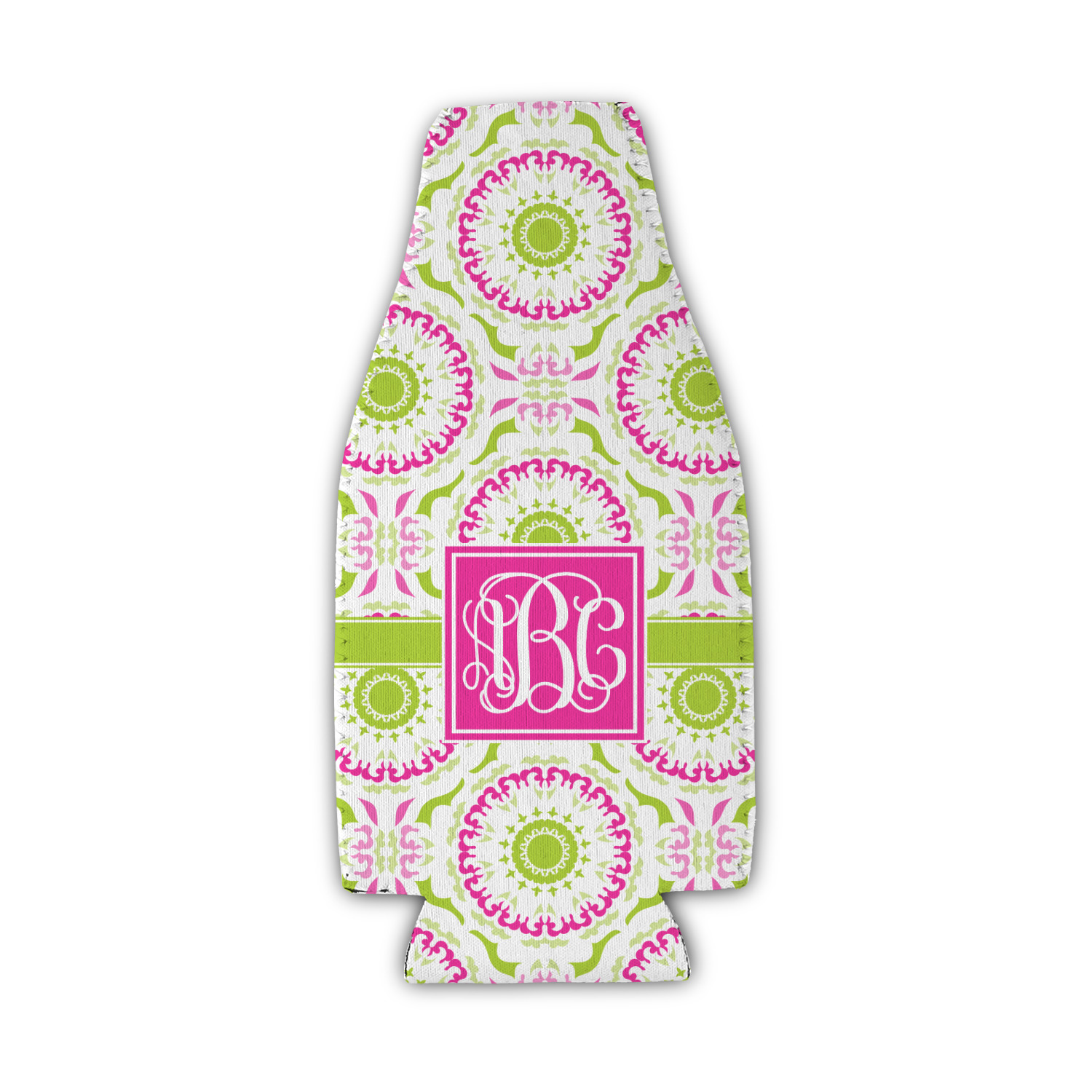 This design has a beautiful suzani floral pattern for the background. The colors in the background are white, hot pink, and lime green. These colors look super cute together. There is a lime green ribbon with a hot pink frame on top. Inside the frame is where your personalization goes. Put text or your initials for a monogram.