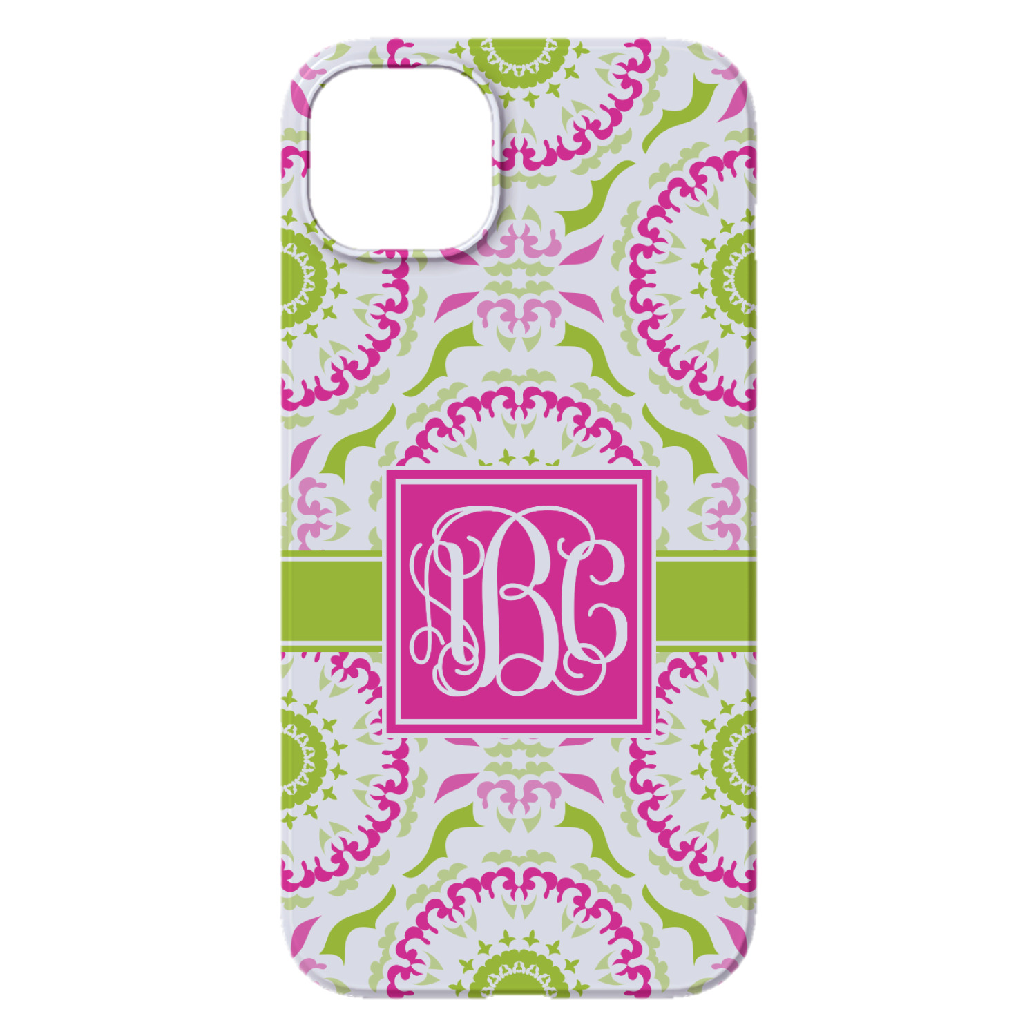 This design has a beautiful suzani floral pattern for the background. The colors in the background are white, hot pink, and lime green. These colors look super cute together. There is a lime green ribbon with a hot pink frame on top. Inside the frame is where your personalization goes. Put text or your initials for a monogram.
