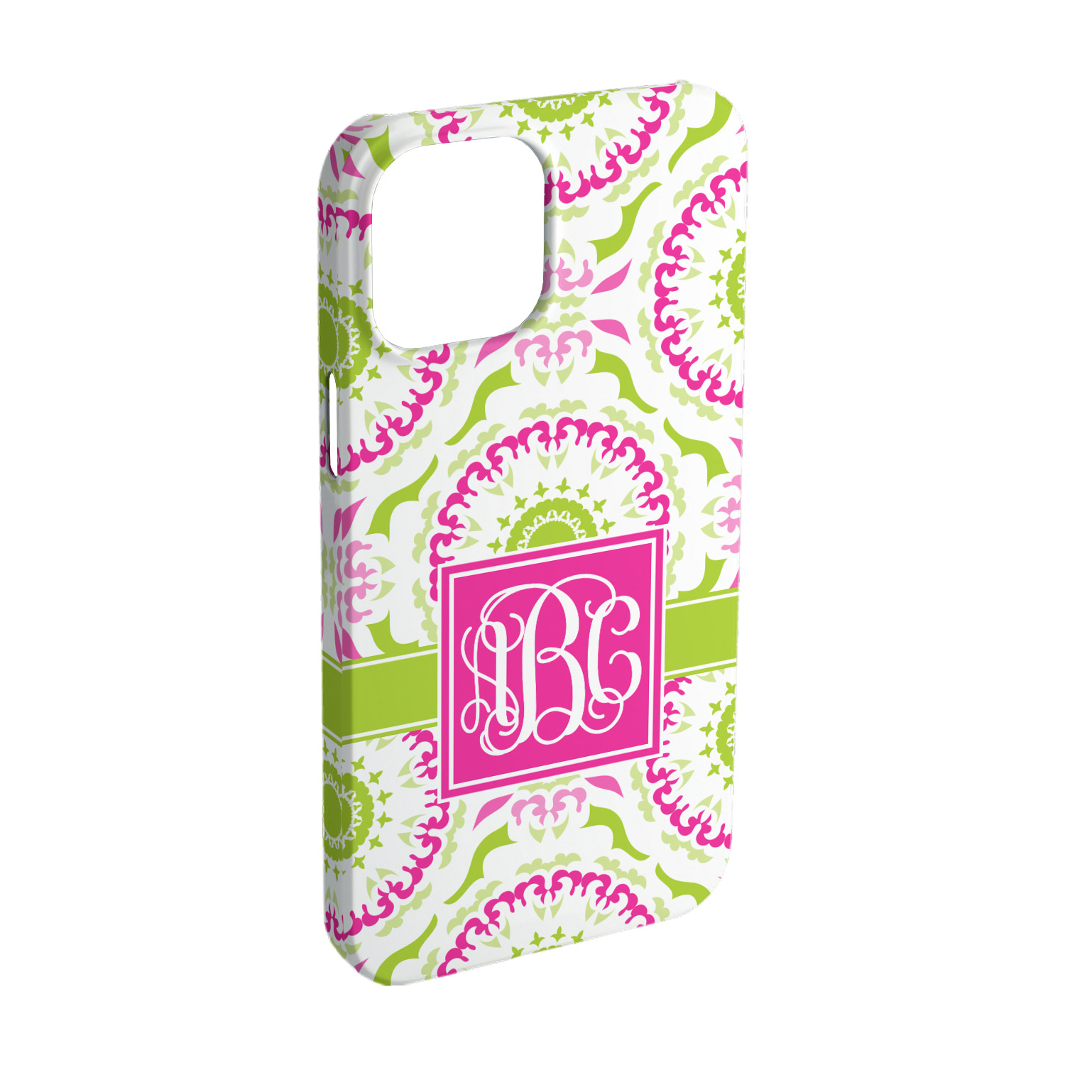 This design has a beautiful suzani floral pattern for the background. The colors in the background are white, hot pink, and lime green. These colors look super cute together. There is a lime green ribbon with a hot pink frame on top. Inside the frame is where your personalization goes. Put text or your initials for a monogram.