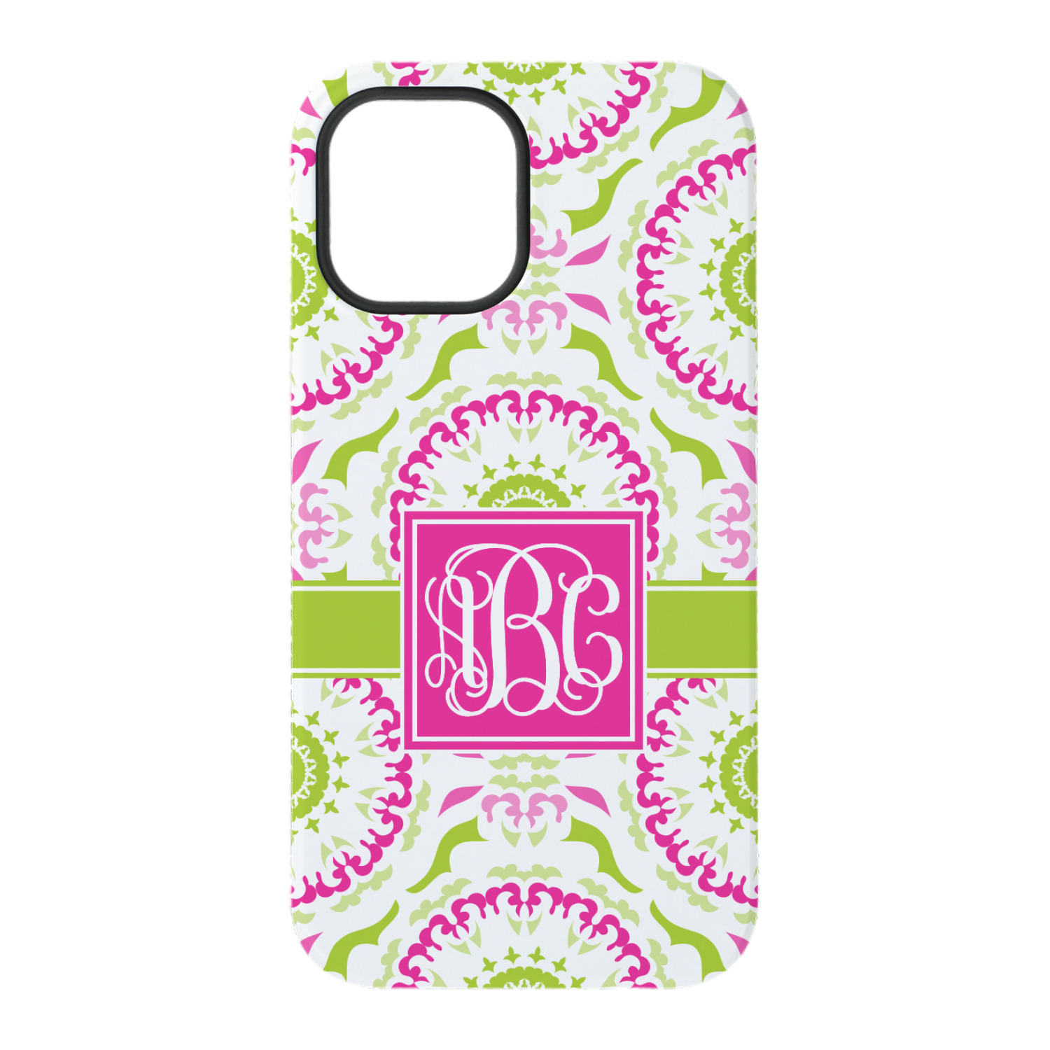This design has a beautiful suzani floral pattern for the background. The colors in the background are white, hot pink, and lime green. These colors look super cute together. There is a lime green ribbon with a hot pink frame on top. Inside the frame is where your personalization goes. Put text or your initials for a monogram.