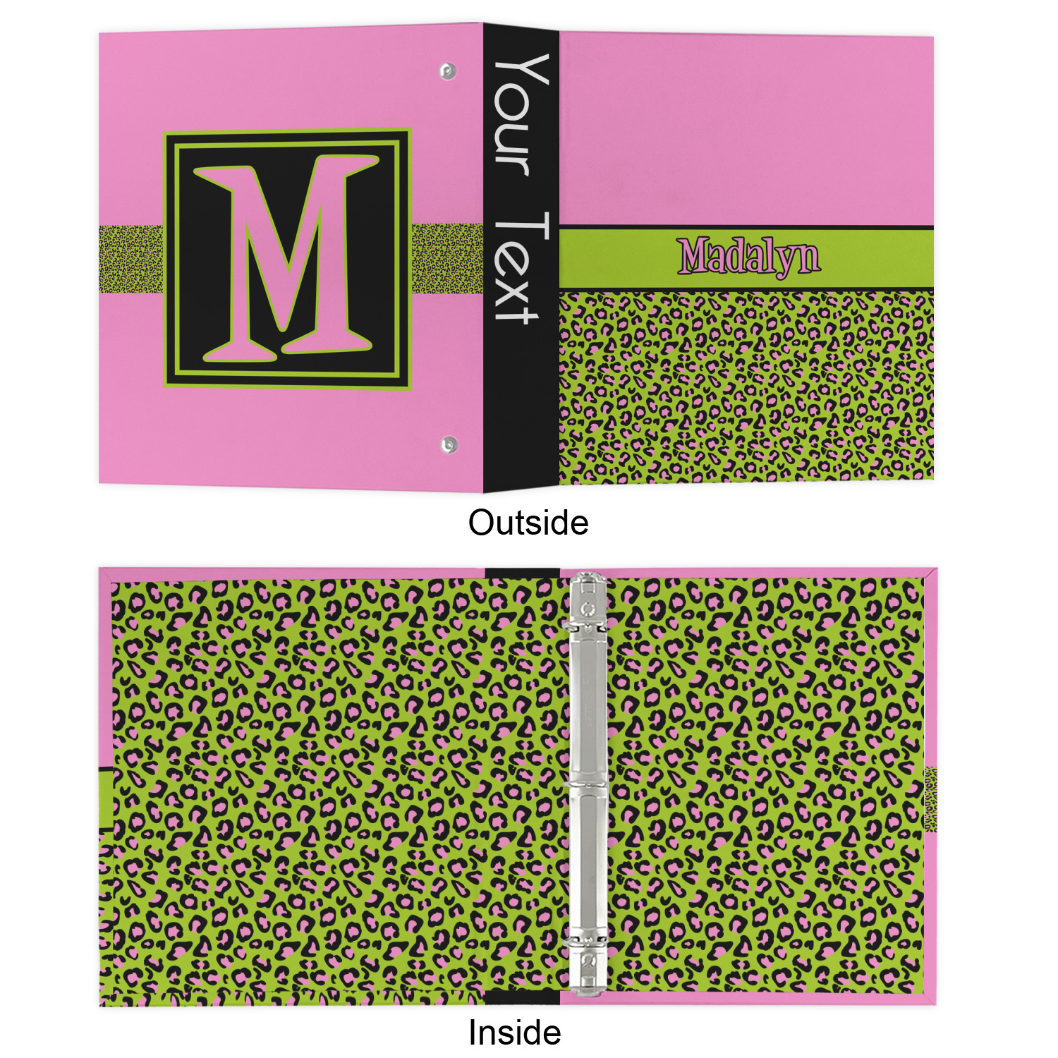 The outside is printed in 3 sections - front cover, spine and back cover - while the inside is printed in a full single print of your choice. The inside boasts a high quality nickel plated binder mechanism with a trigger opening function and is secured to the cardboard binder with posts and screws.