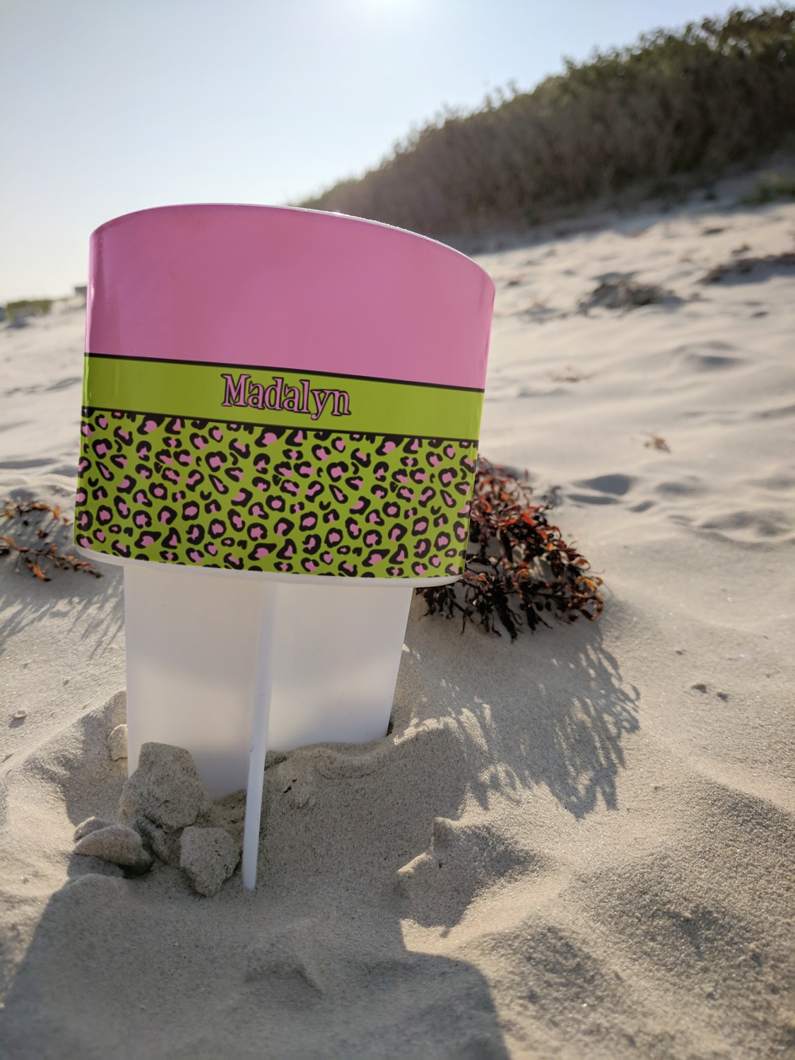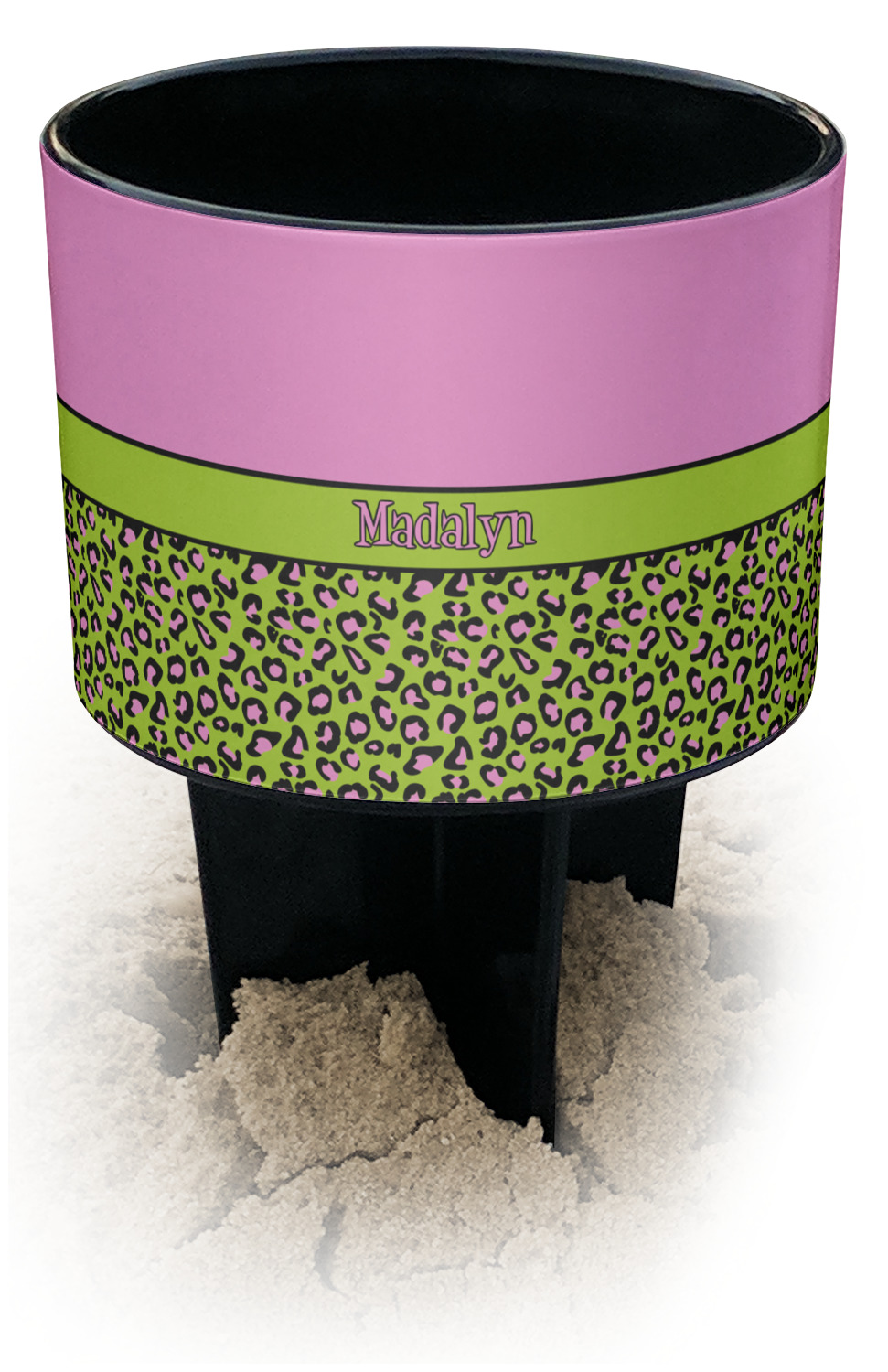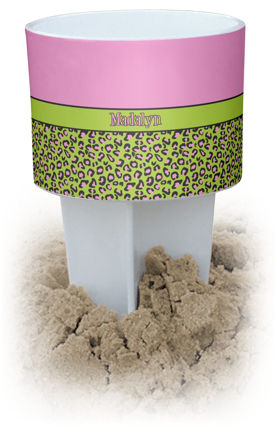 This cup holder has a large stake at its bottom that anchors it to the sand or ground below, while the cup holder rests above the stake. The entire drink holder is made of durable plastic and displays your customization around the cup holder portion. We sell these personalized beach spikers in two different colors: black and white.