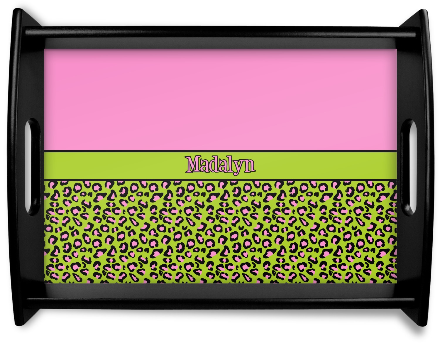 This serving tray with handles features square edges and two rounded sides, creating a very modern look. Each side is fabricated from a beautifully cut, natural wood. The bottom of the interior of the tray displays your customized design in bright, vibrant color. The tray is sold in both a black color and a natural wood look. Each variation of the wood serving tray has two sizes: Small, which is 14" x 10" x 2.25", and Large, which is 19.5" x 13.5" x 2.75".