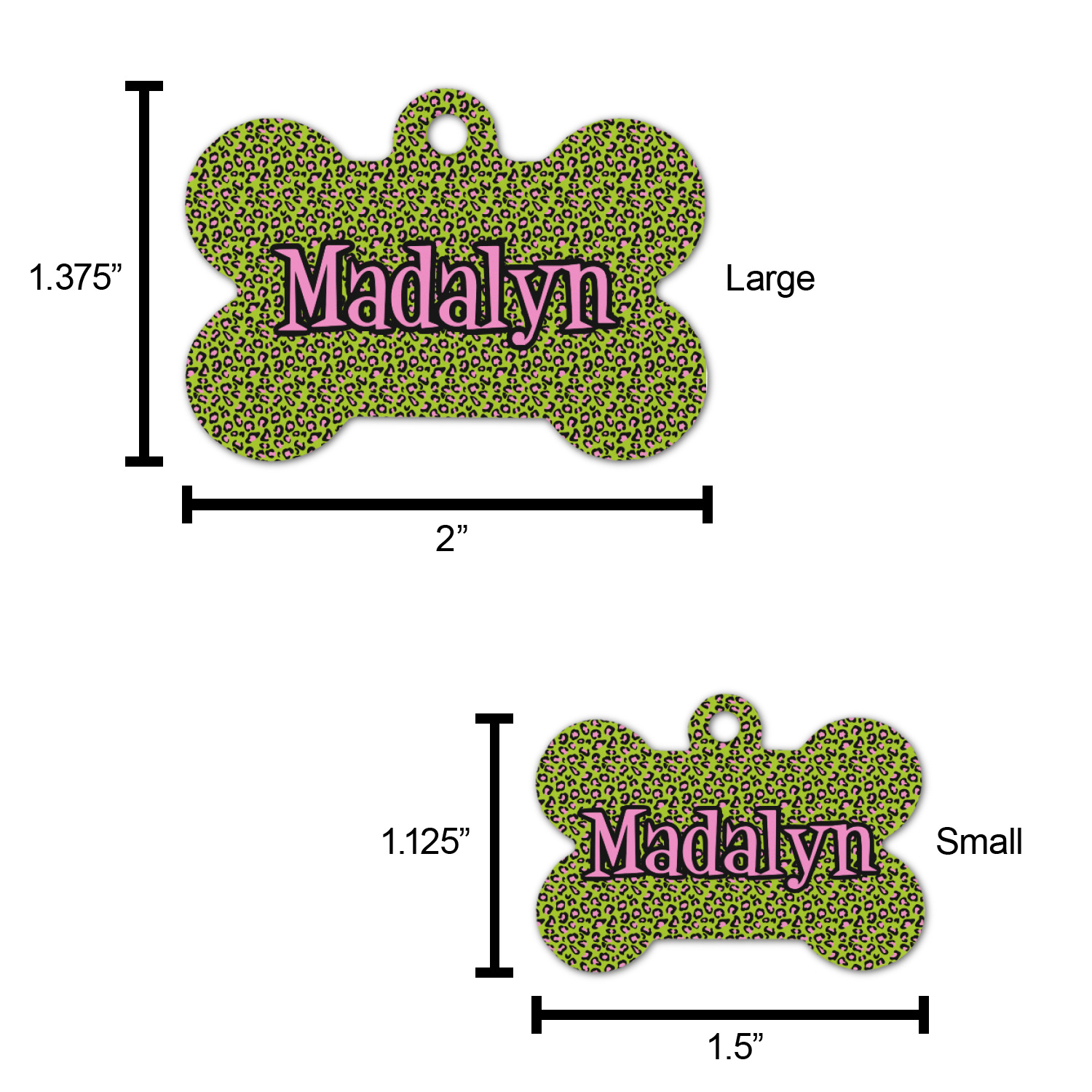The small bone dog tag size is perfect to pair with our small dog collars, the large size pairs well with our large dog collars.