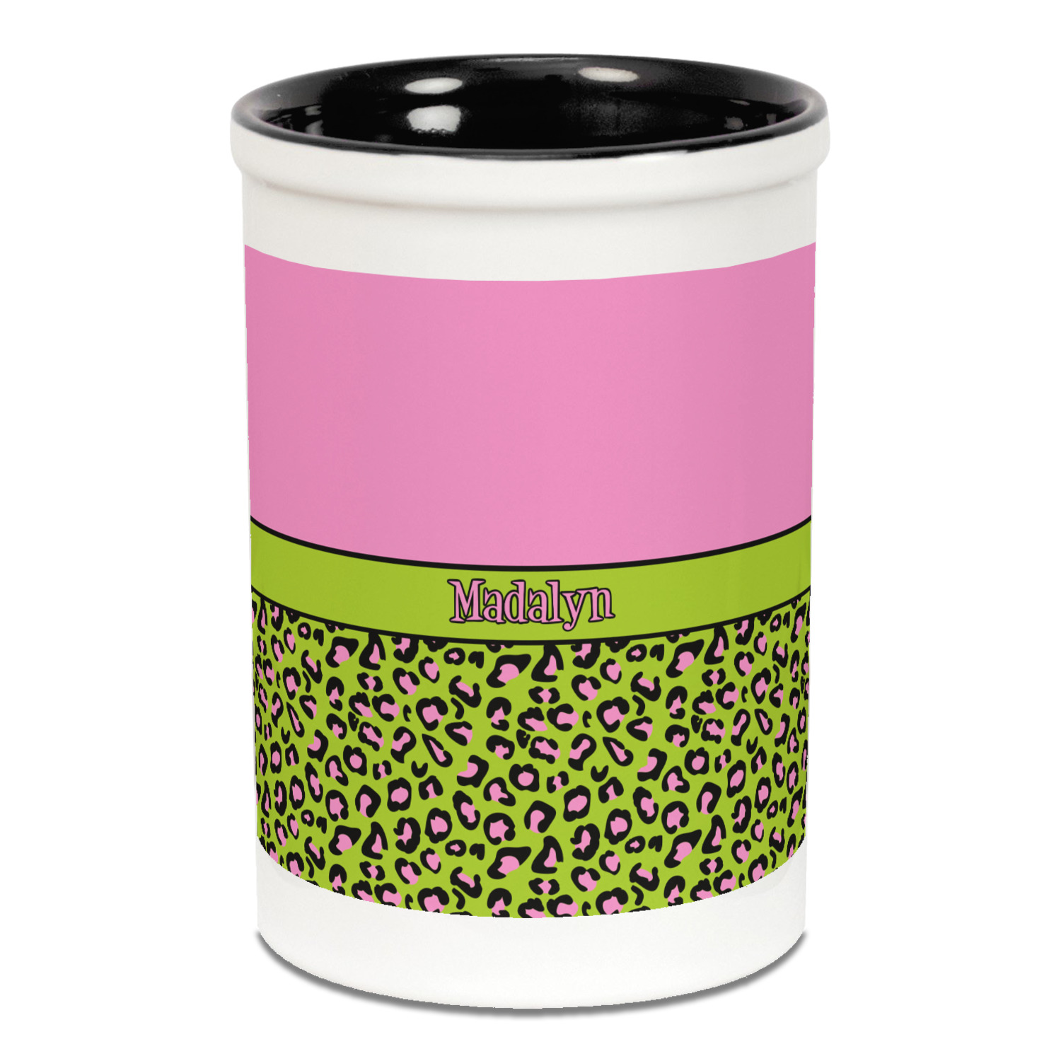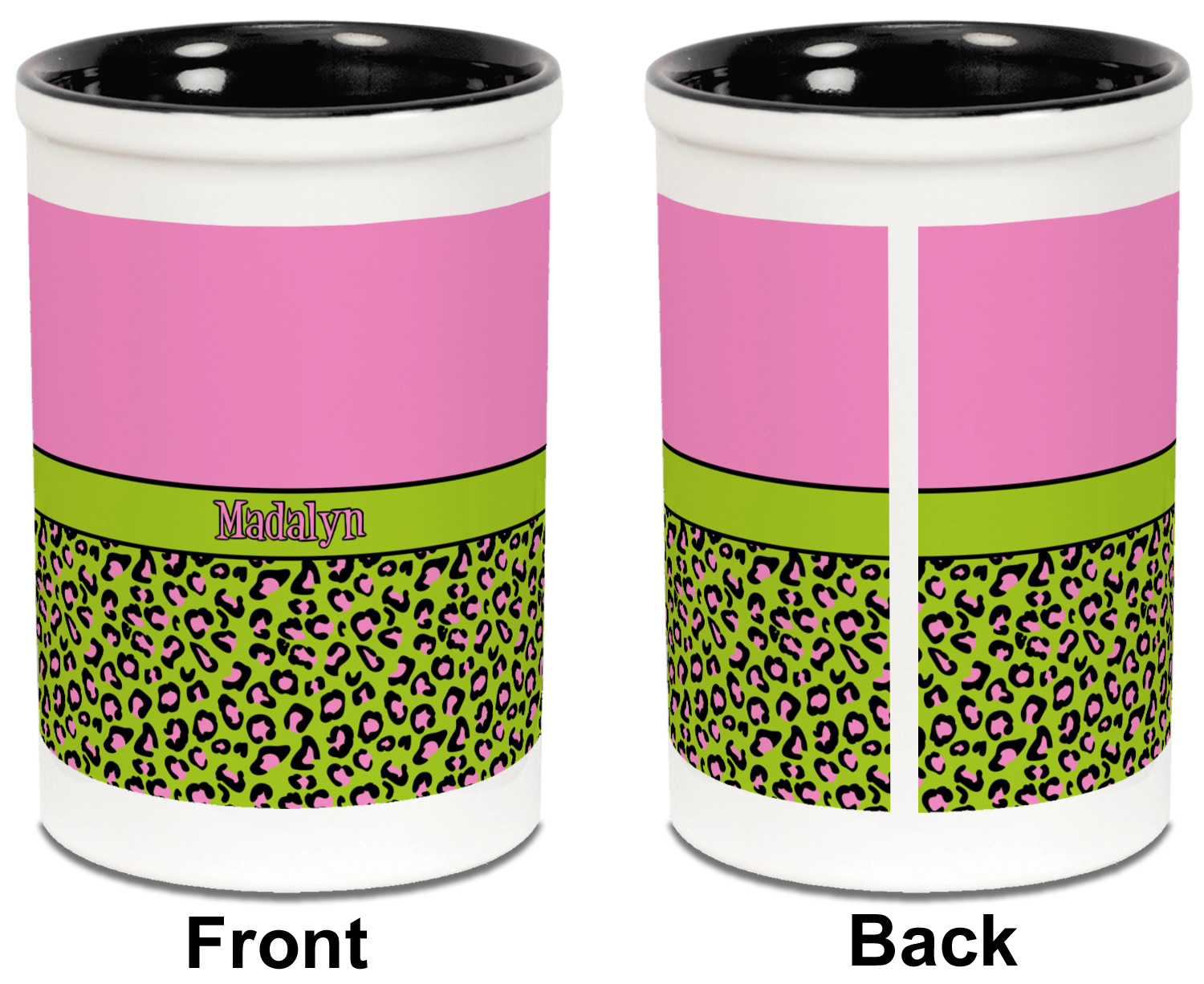 Both the blue and black pencil holders are a ceramic material, giving you a sturdy and long-lasting pen and pencil holder. We print your designs on the exterior of the pencil cup, covering most of the outside surface. There is a small white border on the top and bottom of the exterior of the pen holder, setting apart your design from the interior's color. Our ceramic pen caddy is roughly 3.5" x 3.5" x 5" in dimensions.