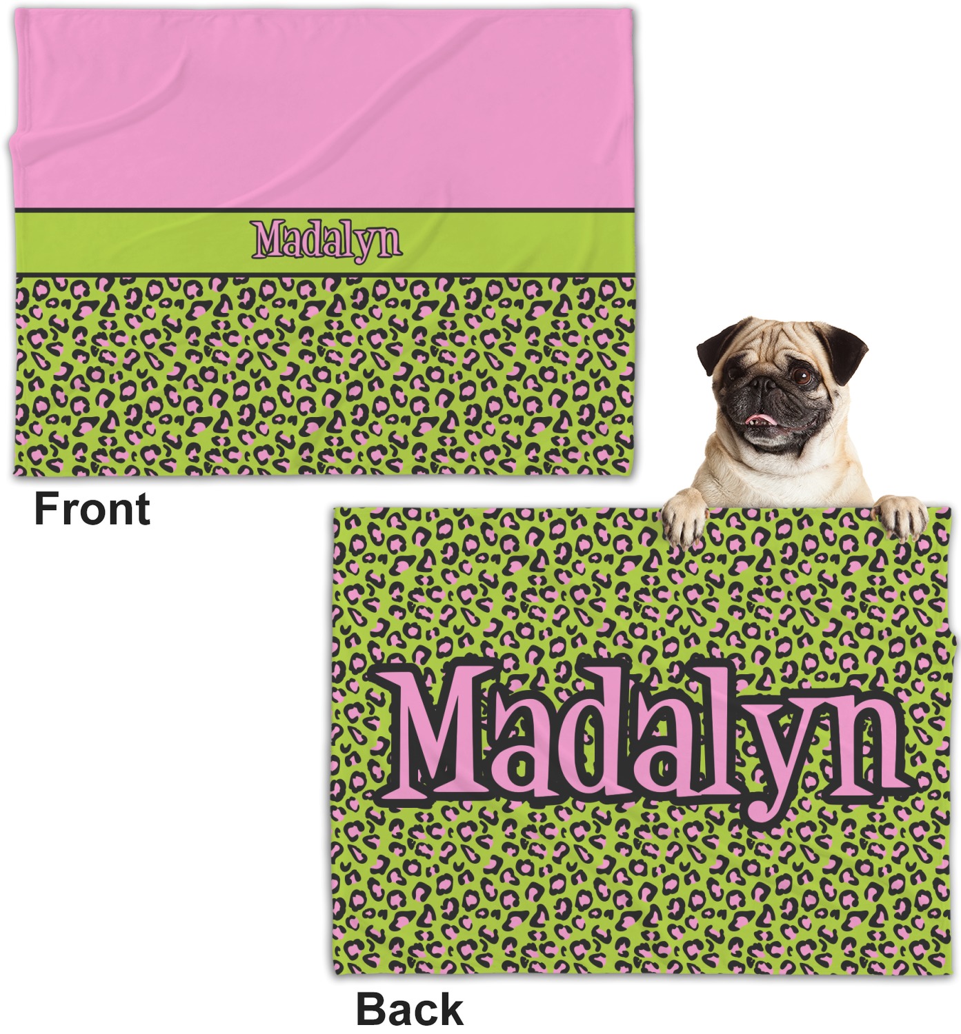 These dog blankets are crafted from a gentle, soft-to-the-touch, minky material. We print your customizations, either matching or differing, on both the top and underside of the blanket. These personalized dog blankets are available in two sizes: regular and large. Our regular size, at 40" x 30", accommodates small and some medium size dogs. At 60" x 50", our large dog blanket is a better fit for bigger breeds. Though specialized for dogs, these blankets still make a thoughtful gift for your favorite feline, or any other pet in mind!