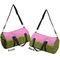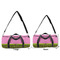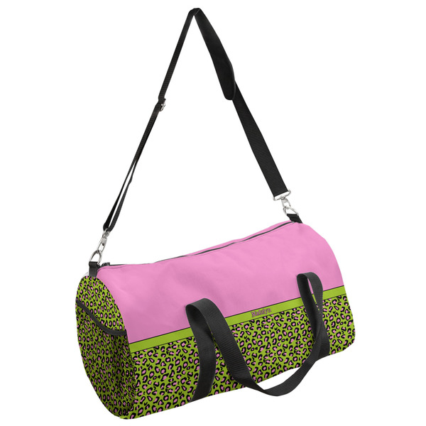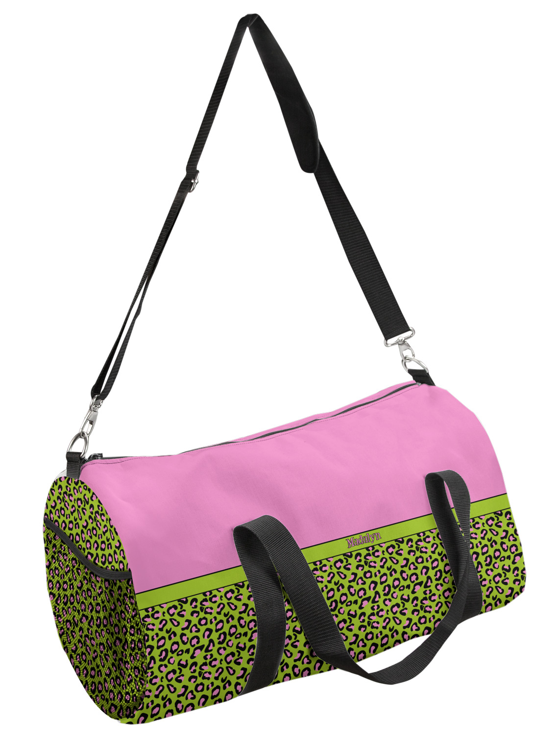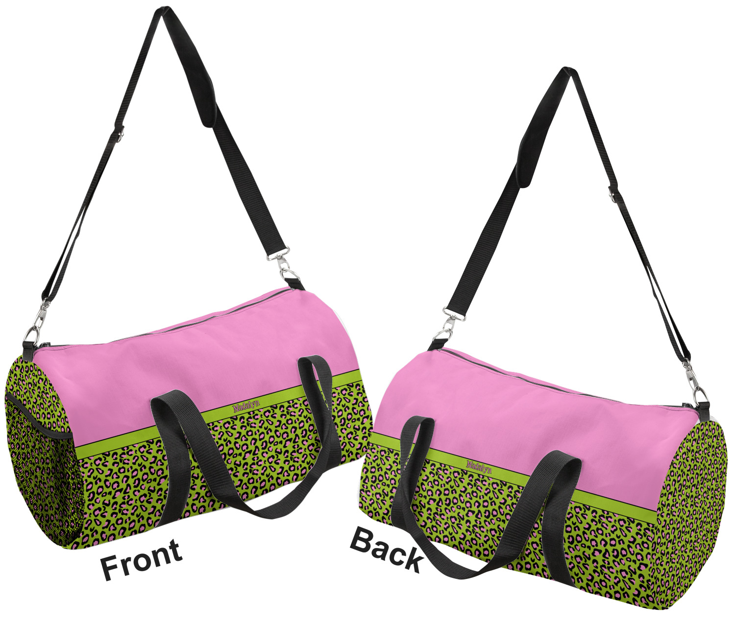 This duffle is a sturdy bag made of a canvas material. It comes in two sizes: Small (19"W x 9.5"H x 9.5"D) and Large (23"W x 12"H x 12"D). The bag is a cylindrical shape with a black adjustable strap and two handles. On one side is an elastic pouch to put a waterbottle or other small item. Your product will be sublimated with your design and is able to be designed on the front, back, and sides. Be sure to remember that the straps may cut into parts of your design if you upload your own artwork.