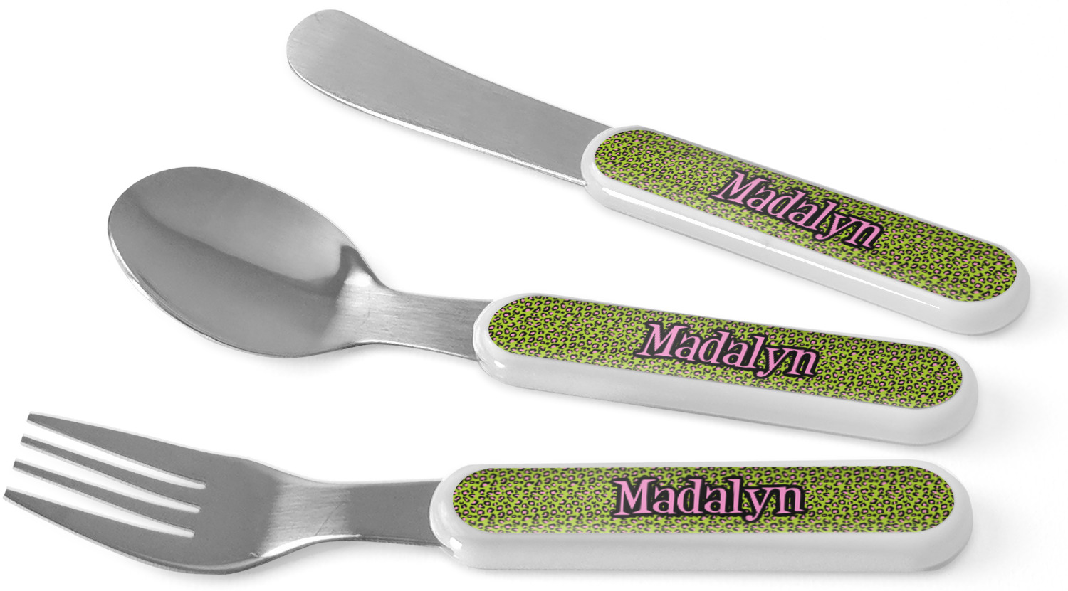 This set of kids' silverware includes a 5.5 inch spoon, fork, and knife, catered to your little one's needs. The prongs of this fork are flat and dull, while our spoon is small enough for tiny mouths, and the dullness of the knife itself resembles a butter knife, at most. These kids' utensils are made of stainless steel, while the handles are crafted from a durable plastic that will withstand the energy and use of your young one. We print your customization across the handles, making the cutlery set unique to your child only.