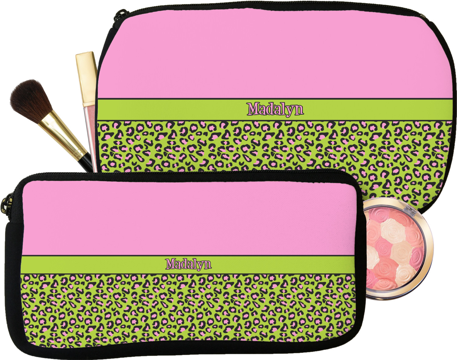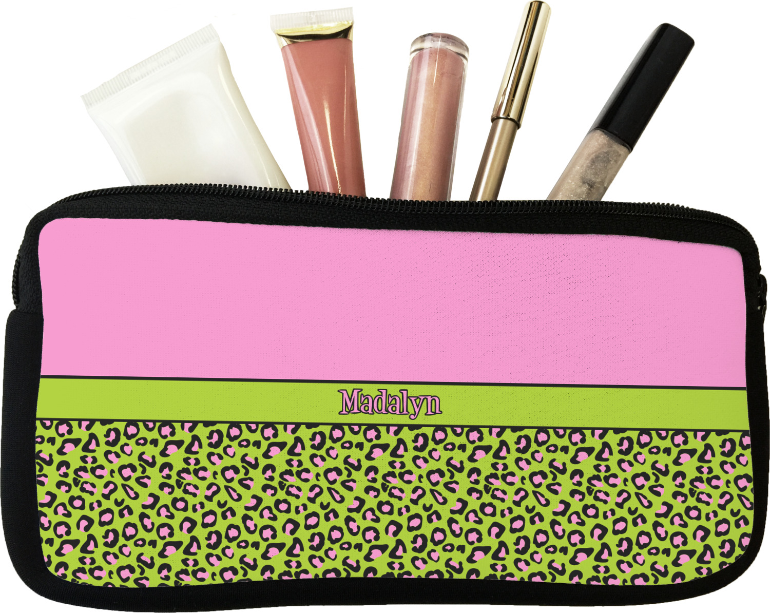 Our personalized makeup bags are available in many different designs, patterns and colors - so you are sure to find one that will love. They are made of neoprene (same material as wet-suits) and thus are water resistant, so spillages in your makeup bag will not end up all over you purse. They are customized on one side and are black on the other side and the zipper is black as well.
