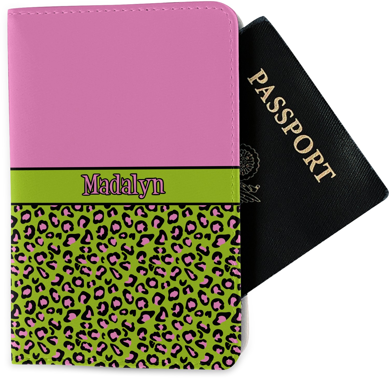 The passport holder has a beautiful inside made of faux leather, while the outside is a smooth slick vinyl like material printed with your personal design.