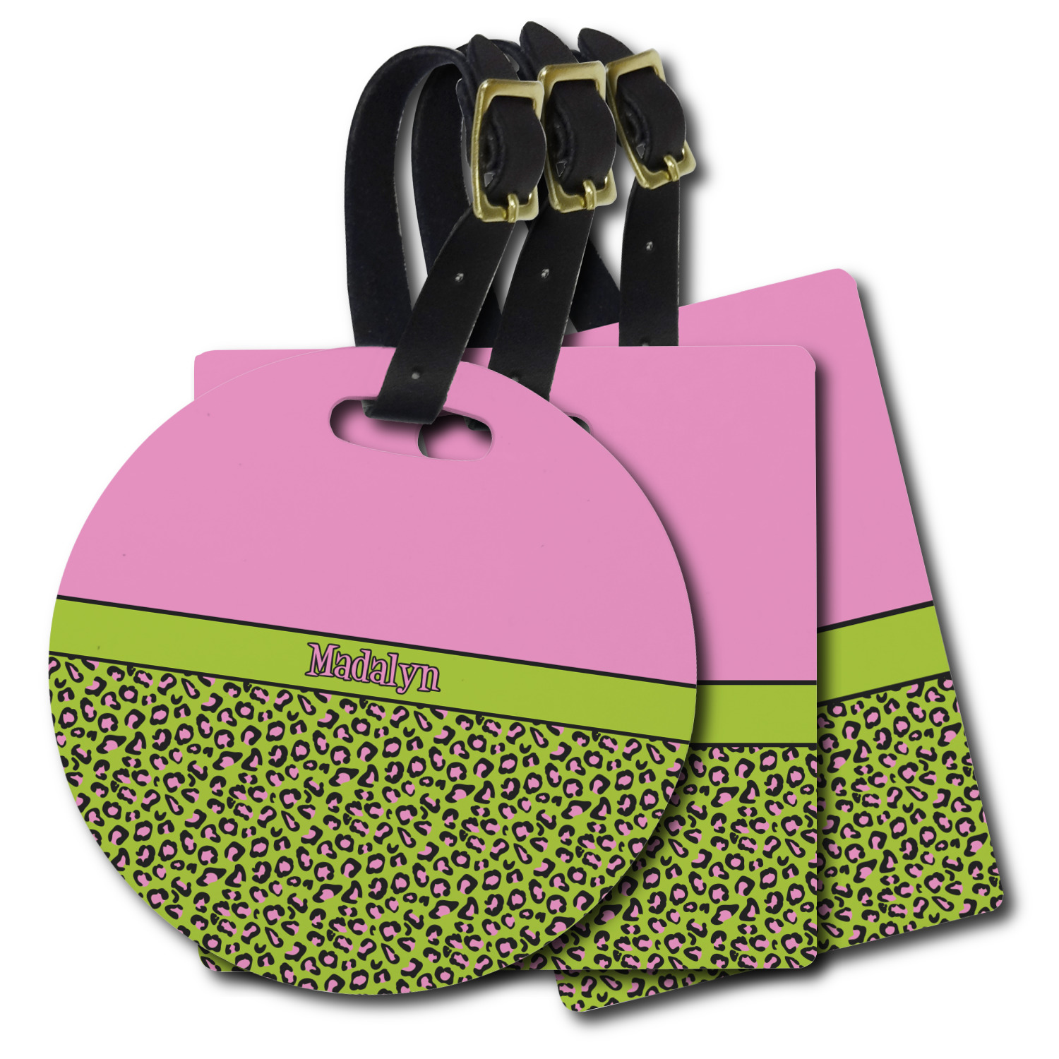 These personalized bag tags are sold in a variety of shapes, so that you may find the product that meets your vision exactly. We sell a round luggage tag, which measures at approximately 4" x 4". Our square luggage tag is about 3.5" x 3.5", while our rectangular version is 2.75" x 4 ".