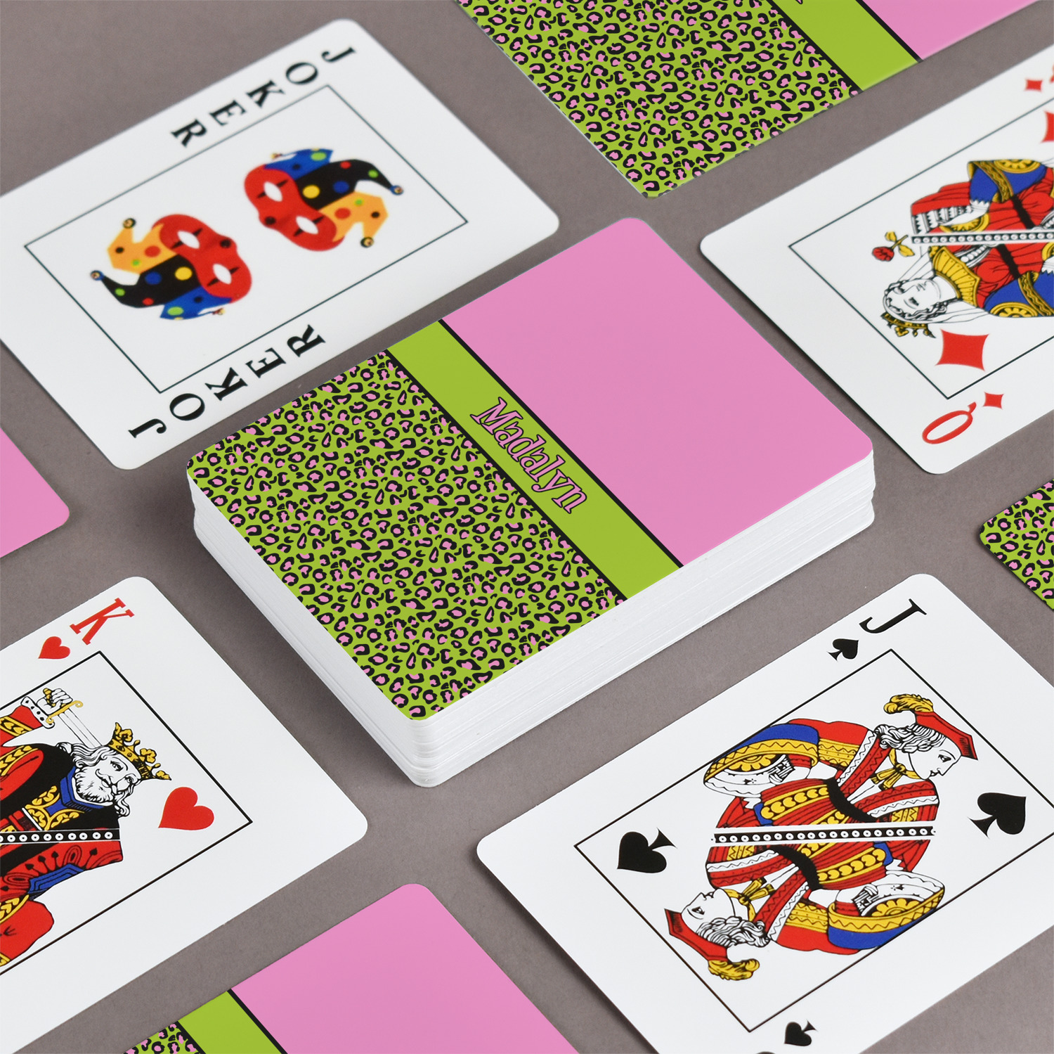 The customization / personalization is printed on the back side. The playing cards have a low gloss coating on both sides. The cards are packaged in a clear plastic box.