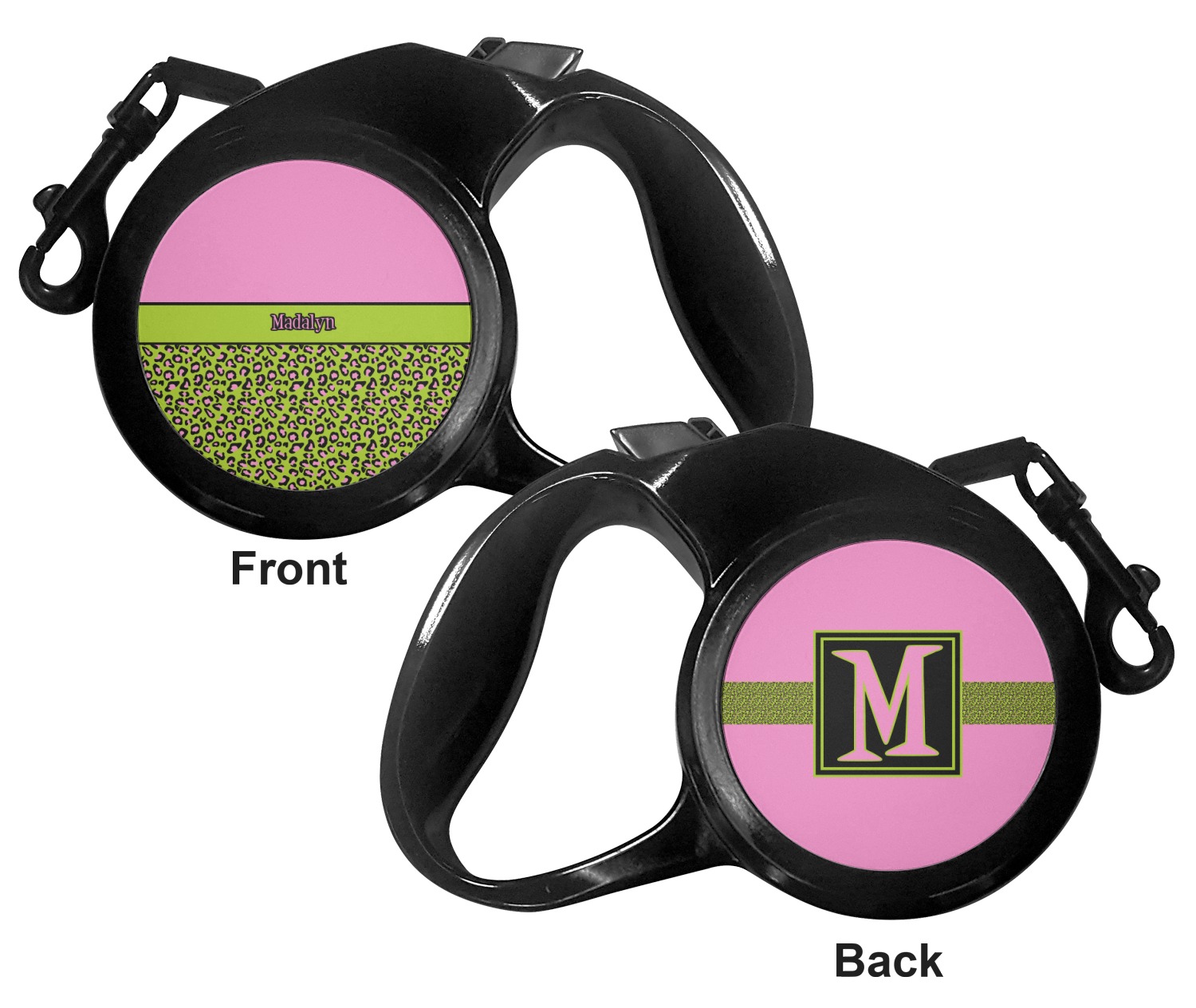 The leash's plastic handle is accommodating of your grip and displays your customization on both sides. The dog leash also features the traditional bolt snap clip, for easy fastening to your dog's collar. The leash and leash handle themselves are both black in color.