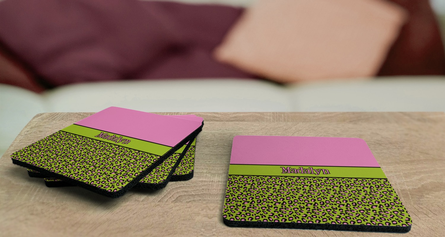 These drink coasters have a smooth, polyester top and a textured, rubber backing on its bottom. The non-slip rubber backing underneath works to keep any spills at bay. At 4 by 4 by 0.25 inches thick, these custom coasters are a suitable size for most drinkware. Your personalization is displayed atop the face of the cup coaster. We sell these rubber coasters in two different shapes: square and round. You can buy each shape as singulars or as a set of 4.