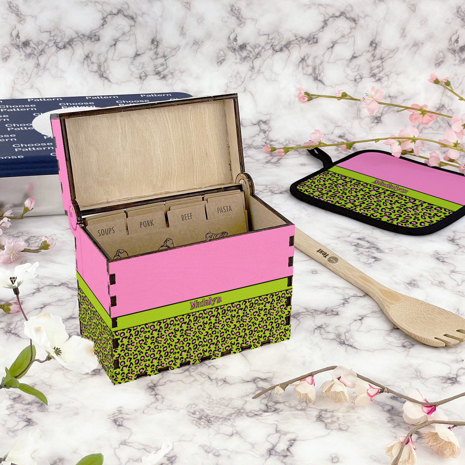 Using our design library you can design your recipe box to be personalized just for you. We will then laser engrave it and assemble it and have it ready for you to insert your recipe cards when you recieve it.