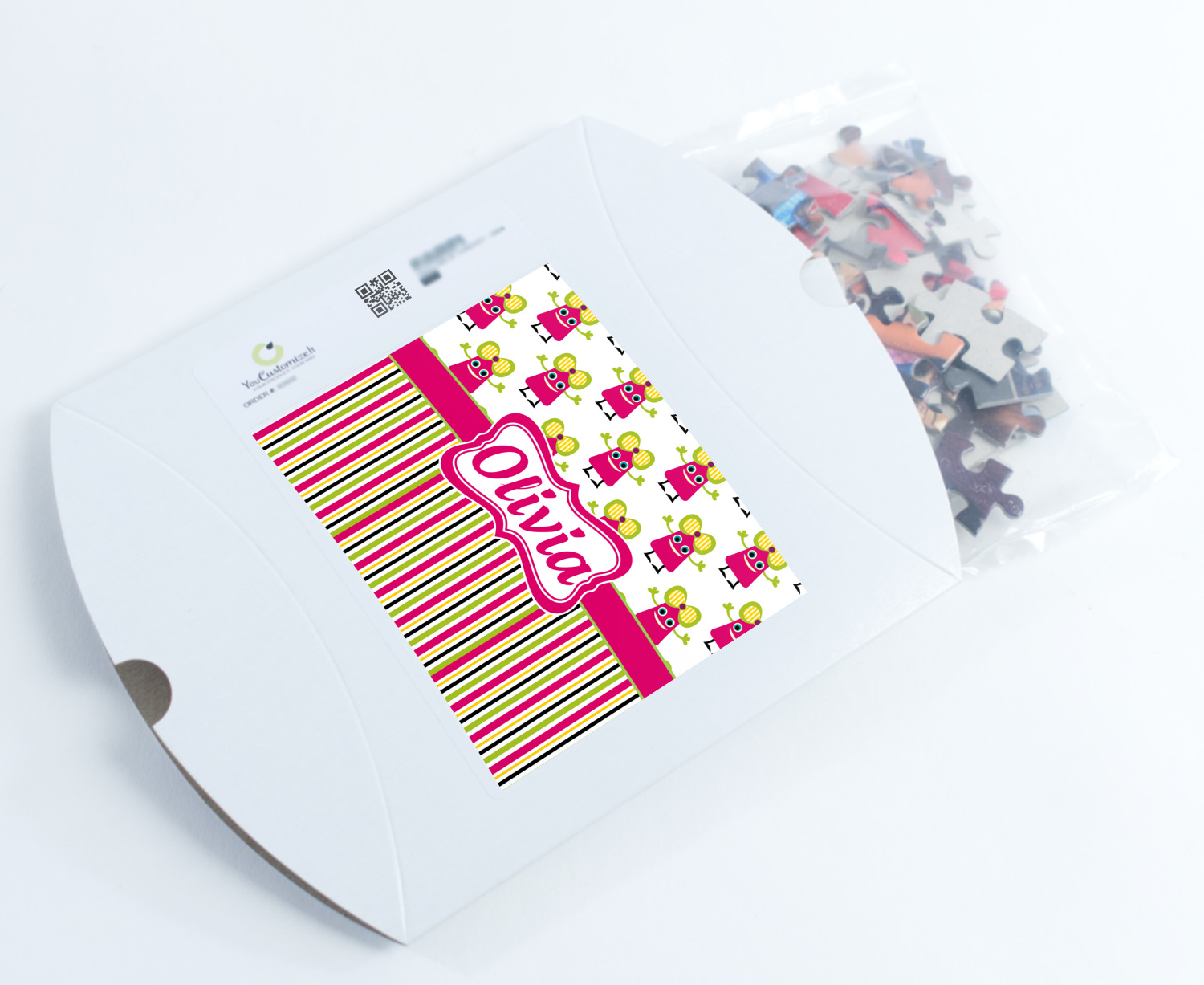 You can also upload your logo or art that you or your kids drew. To create more challenging jigsaw puzzles, you can create a pattern from with your logo or artwork. You can also add other elements such as text or personalization.