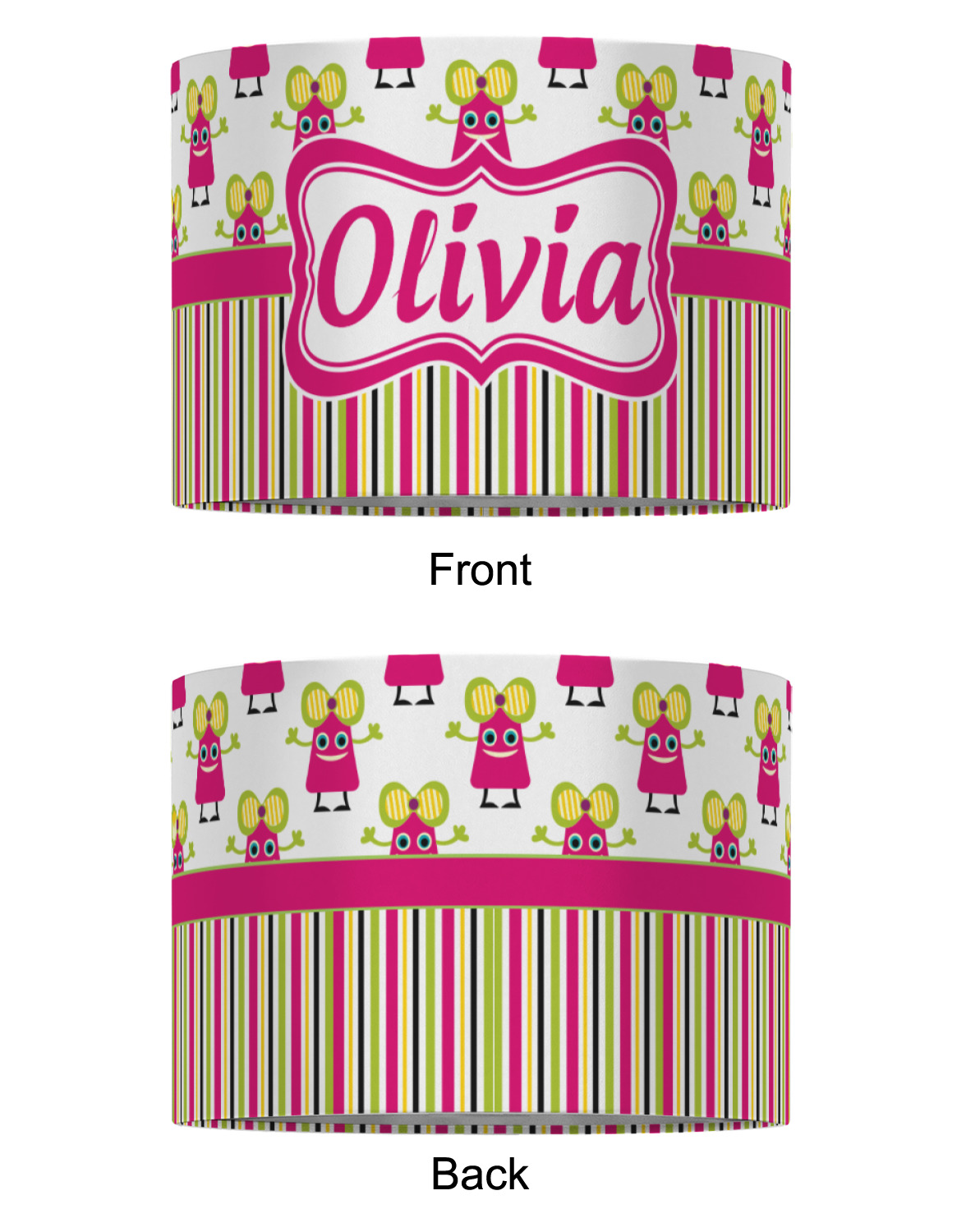 Not all little monsters have to be scary. Our one of kind girly girl monster pattern will sure to delight your little one. This little hot pink monster is decorated with a huge green, yellow, and purple bow. Set on a white background she is just begging for a hug. A classic candy striped pattern below using coordinating colors brings this design together. A wide hot pink band trimmed in lime green adds a designer touch.