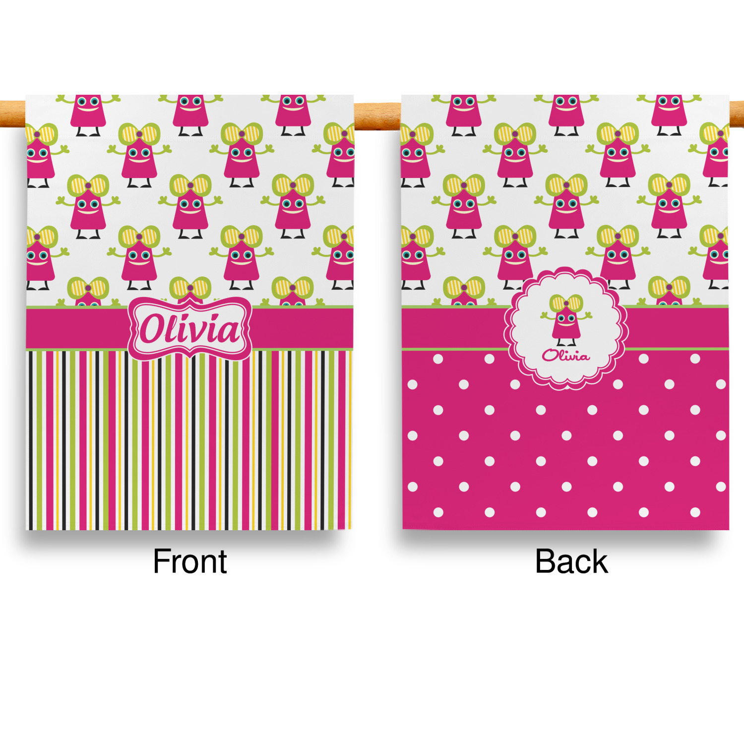 Not all little monsters have to be scary. Our one of kind girly girl monster pattern will sure to delight your little one. This little hot pink monster is decorated with a huge green, yellow, and purple bow. Set on a white background she is just begging for a hug. A classic candy striped pattern below using coordinating colors brings this design together. A wide hot pink band trimmed in lime green adds a designer touch.