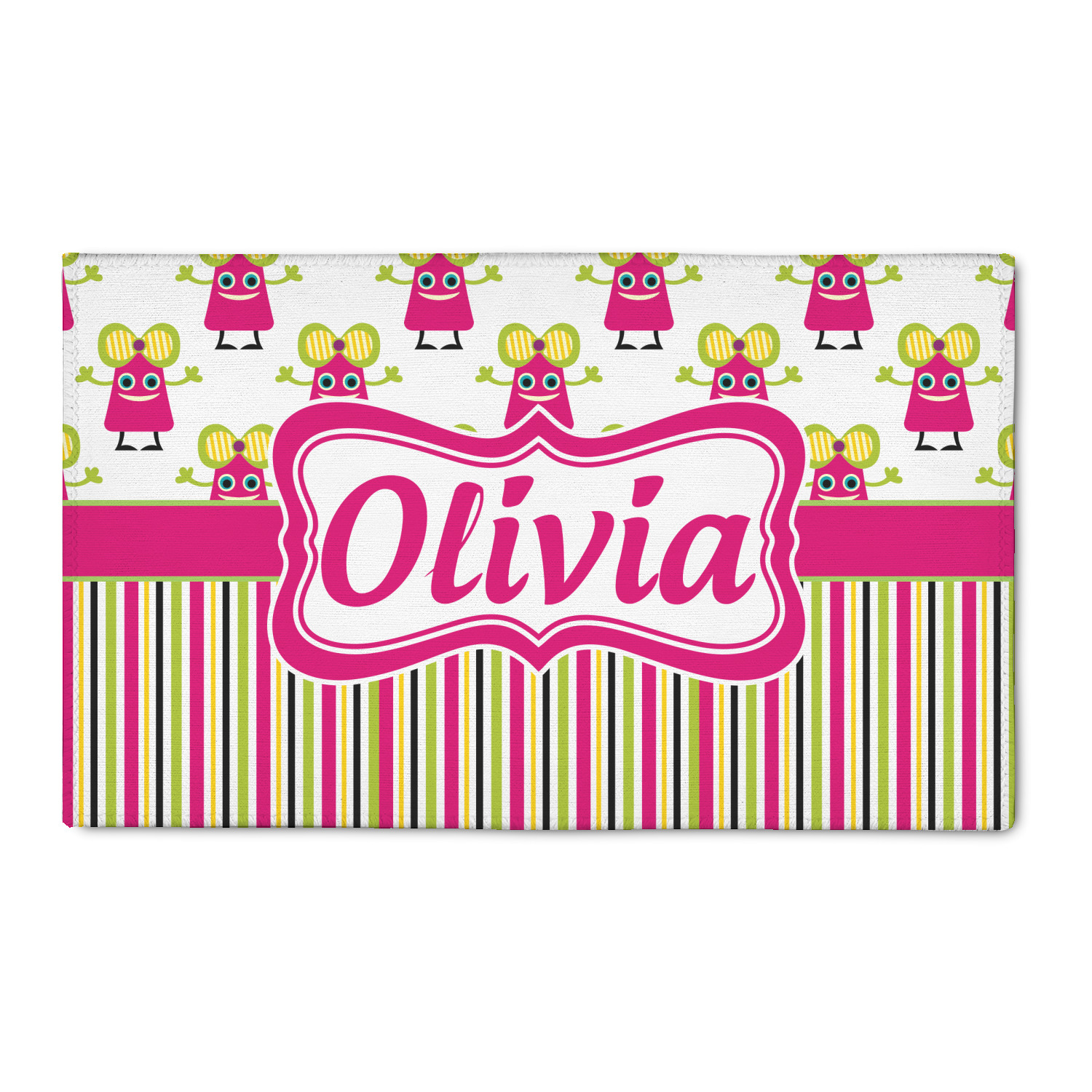 Not all little monsters have to be scary. Our one of kind girly girl monster pattern will sure to delight your little one. This little hot pink monster is decorated with a huge green, yellow, and purple bow. Set on a white background she is just begging for a hug. A classic candy striped pattern below using coordinating colors brings this design together. A wide hot pink band trimmed in lime green adds a designer touch.