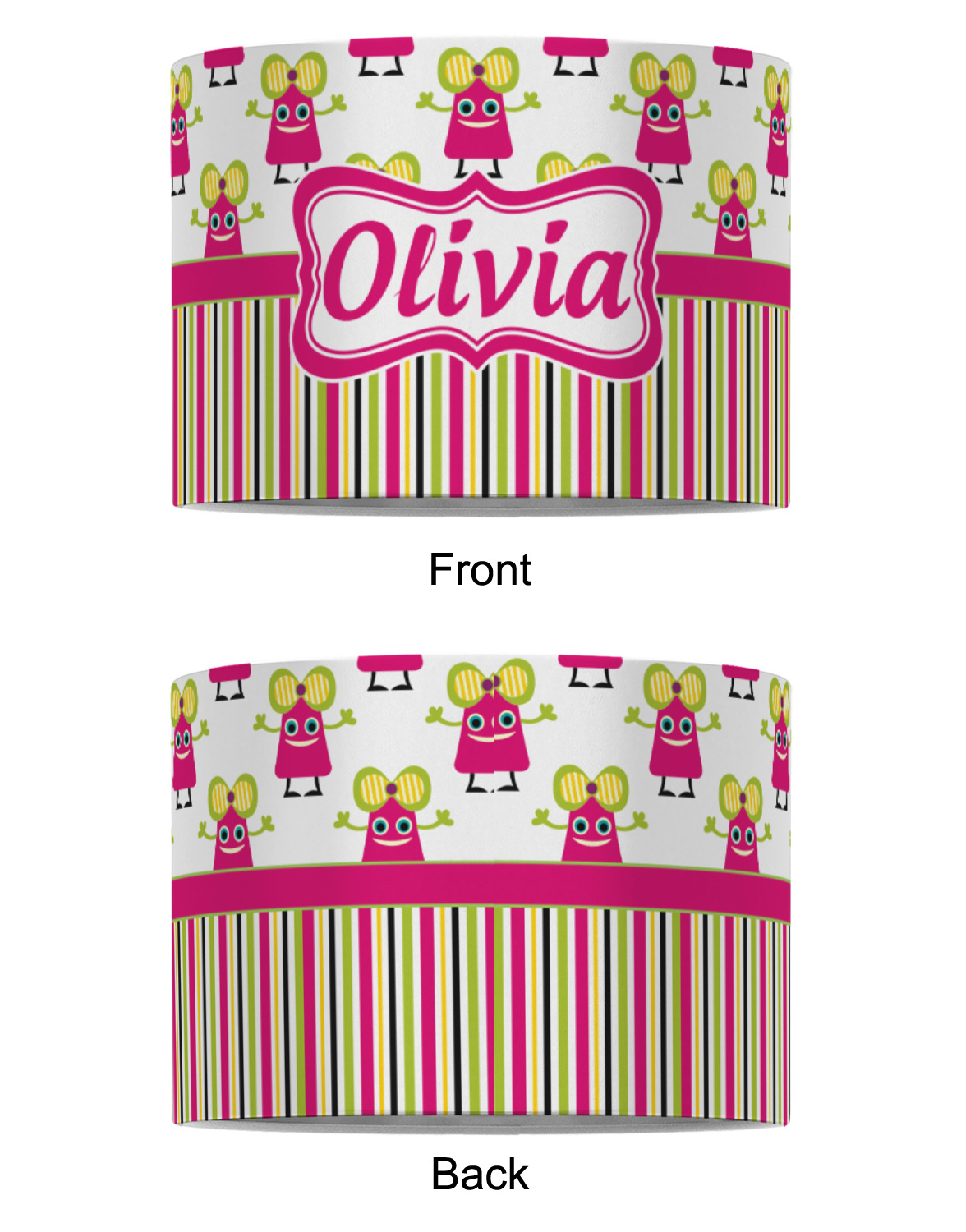 Not all little monsters have to be scary. Our one of kind girly girl monster pattern will sure to delight your little one. This little hot pink monster is decorated with a huge green, yellow, and purple bow. Set on a white background she is just begging for a hug. A classic candy striped pattern below using coordinating colors brings this design together. A wide hot pink band trimmed in lime green adds a designer touch.