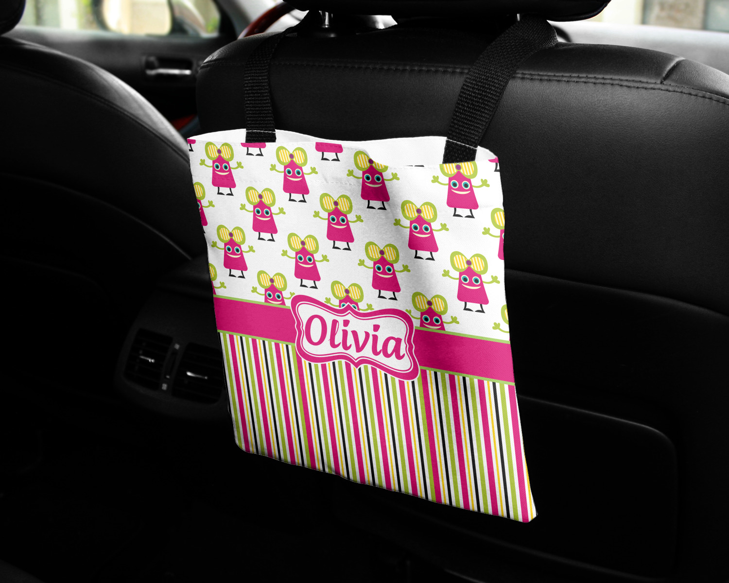 These car back seat organizers are sturdy tote-like bags, fabricated from a robust polyester, and features a single handle on the back side. The strap features an attachable velcro for easy attachment to headrests, grocery carts, car seats, and more. Simply undo the velcro, loop the strap around the headrest, reattach the velcro, and let the organizer hang from the front seat. These car organizers are the perfect means of increasing your backseat's legroom, while storing multiple items in one place for better accessibility. Each car back seat organizer measures at 10 by 10 inches, and features your personalized design printed across its front and back.