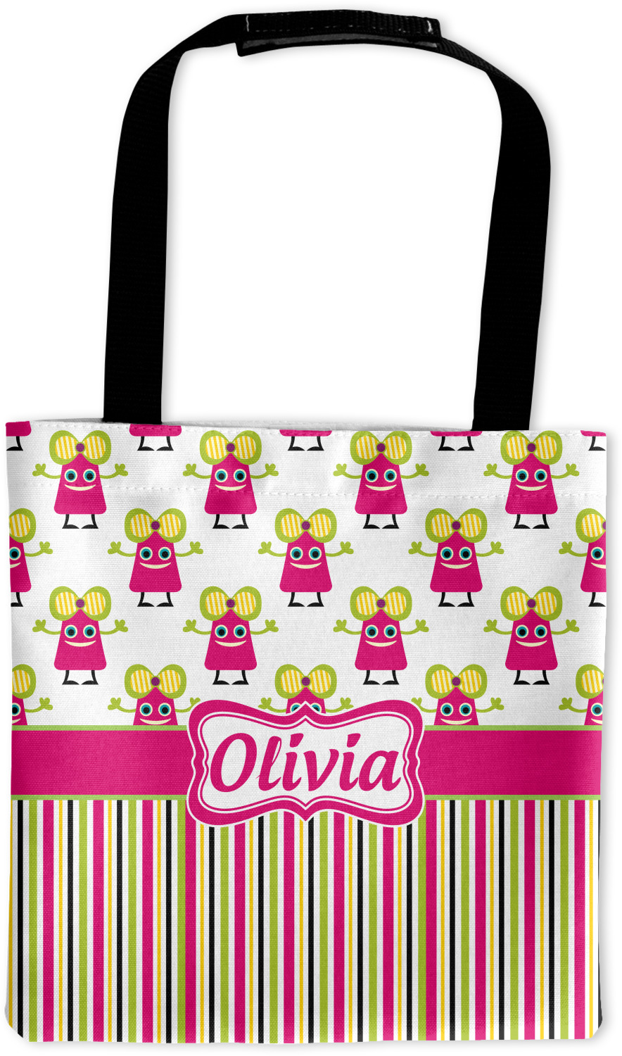 Not all little monsters have to be scary. Our one of kind girly girl monster pattern will sure to delight your little one. This little hot pink monster is decorated with a huge green, yellow, and purple bow. Set on a white background she is just begging for a hug. A classic candy striped pattern below using coordinating colors brings this design together. A wide hot pink band trimmed in lime green adds a designer touch.