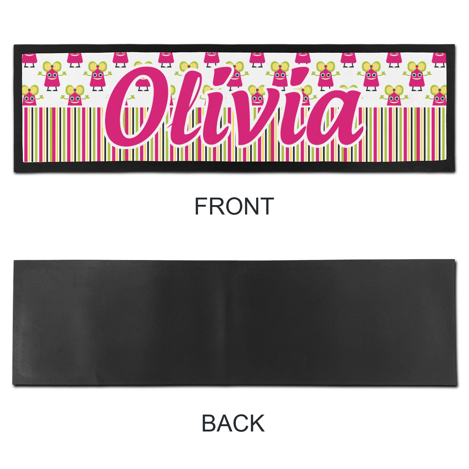 Not all little monsters have to be scary. Our one of kind girly girl monster pattern will sure to delight your little one. This little hot pink monster is decorated with a huge green, yellow, and purple bow. Set on a white background she is just begging for a hug. A classic candy striped pattern below using coordinating colors brings this design together. A wide hot pink band trimmed in lime green adds a designer touch.