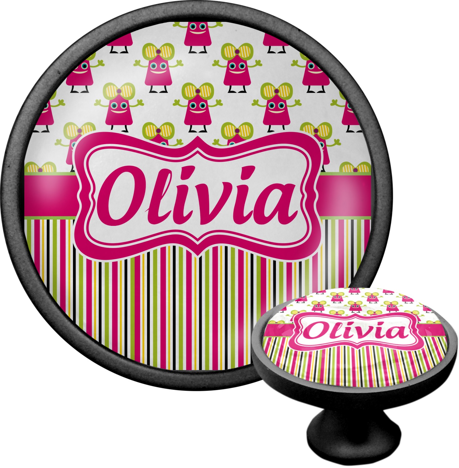 We sell these cabinet pulls in two different colors to better match your room's color scheme. We offer an oil-rubbed bronze base that is black in color, and a satin nickel option, which has a silver color. Your design is displayed across a high gloss vinyl insert that is placed on top of these cabinet handles. We then place a 1 inch thick glass cabochon atop the design, which seals the cabinet knob and makes the colors of your customization stand out. These custom cabinet knobs are approximately 1.3 inches in diameter. Your purchase includes a 1 inch screw that can be used to mount the knob to any cabinet in your home.