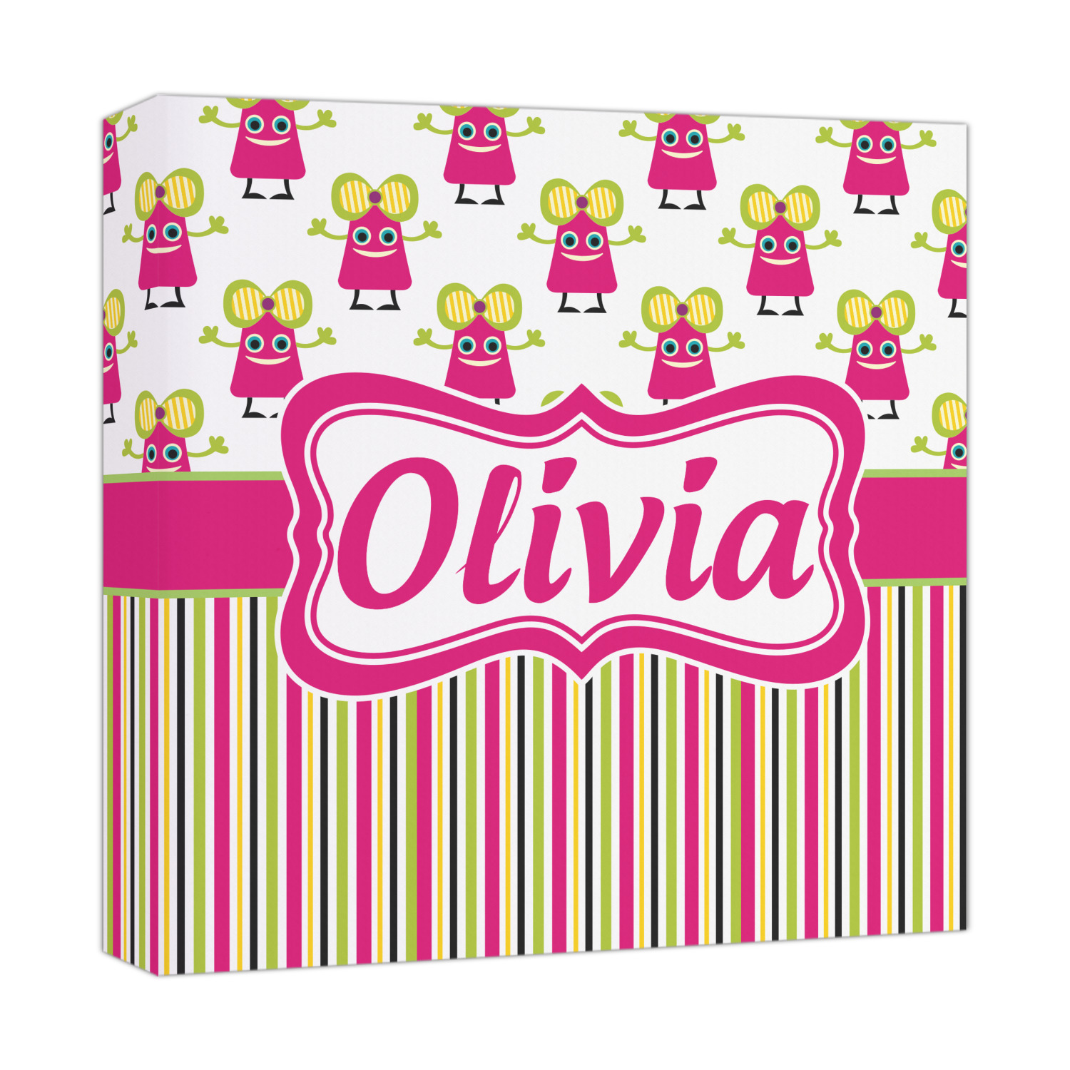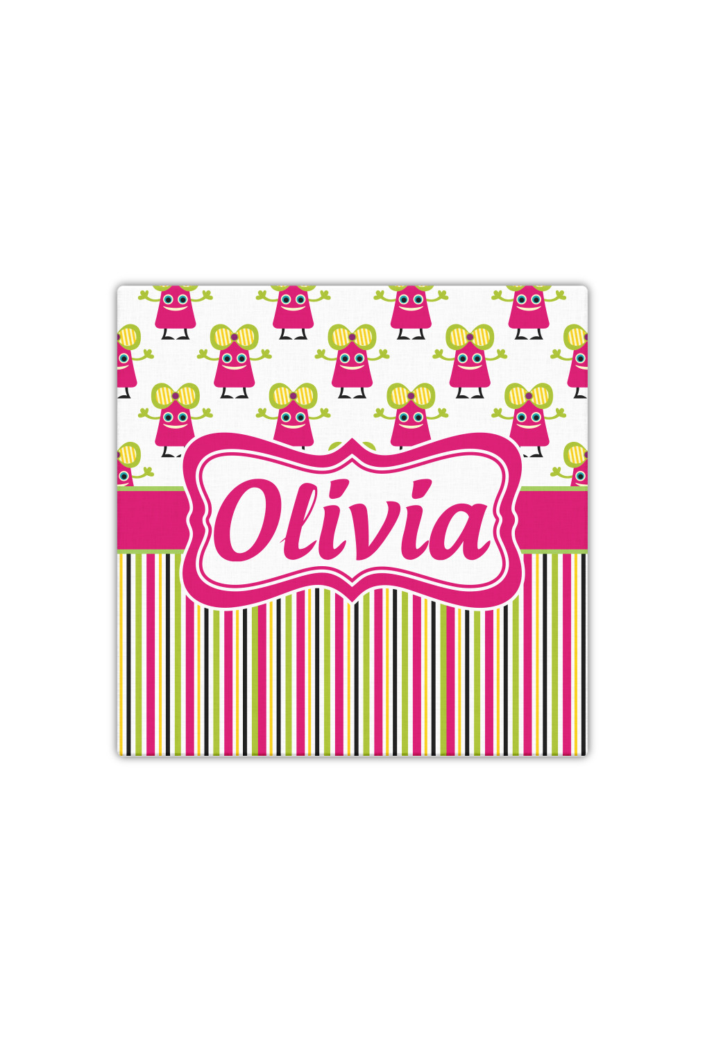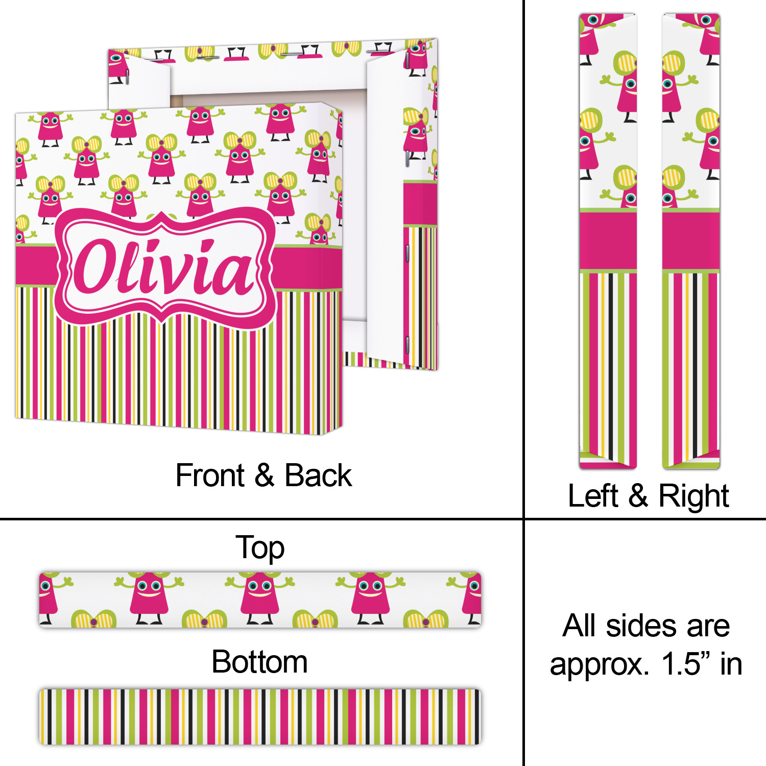 Not all little monsters have to be scary. Our one of kind girly girl monster pattern will sure to delight your little one. This little hot pink monster is decorated with a huge green, yellow, and purple bow. Set on a white background she is just begging for a hug. A classic candy striped pattern below using coordinating colors brings this design together. A wide hot pink band trimmed in lime green adds a designer touch.