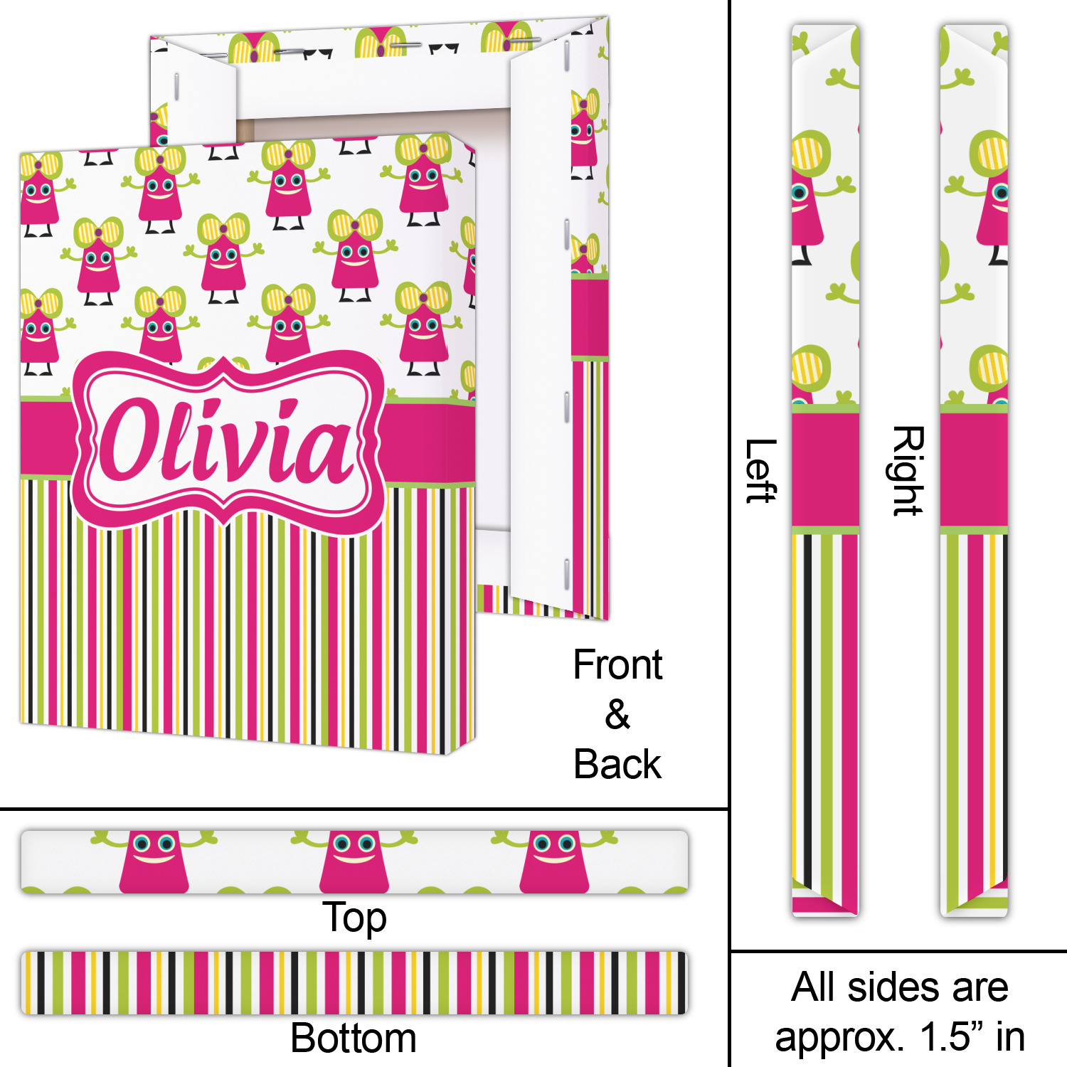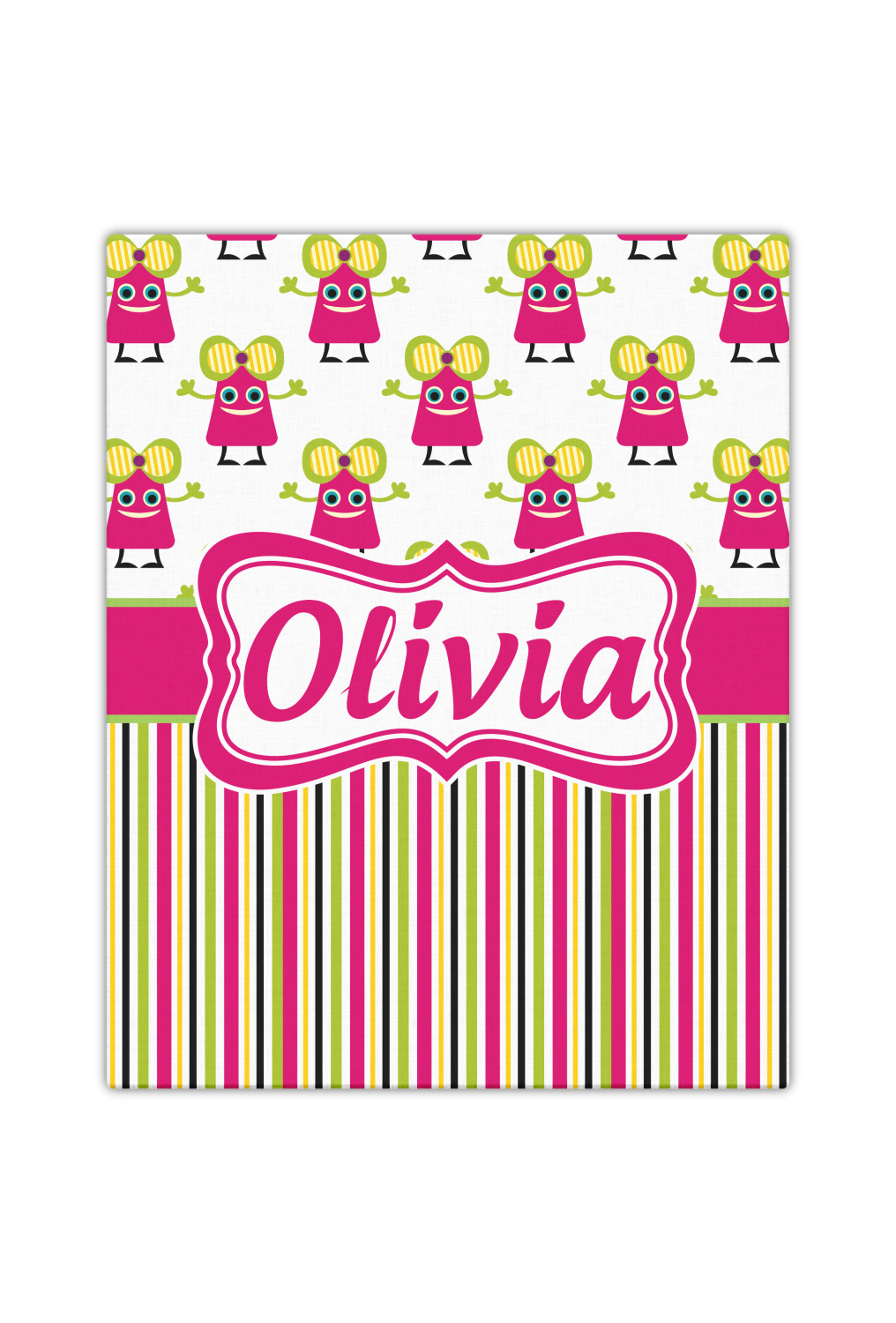 Not all little monsters have to be scary. Our one of kind girly girl monster pattern will sure to delight your little one. This little hot pink monster is decorated with a huge green, yellow, and purple bow. Set on a white background she is just begging for a hug. A classic candy striped pattern below using coordinating colors brings this design together. A wide hot pink band trimmed in lime green adds a designer touch.