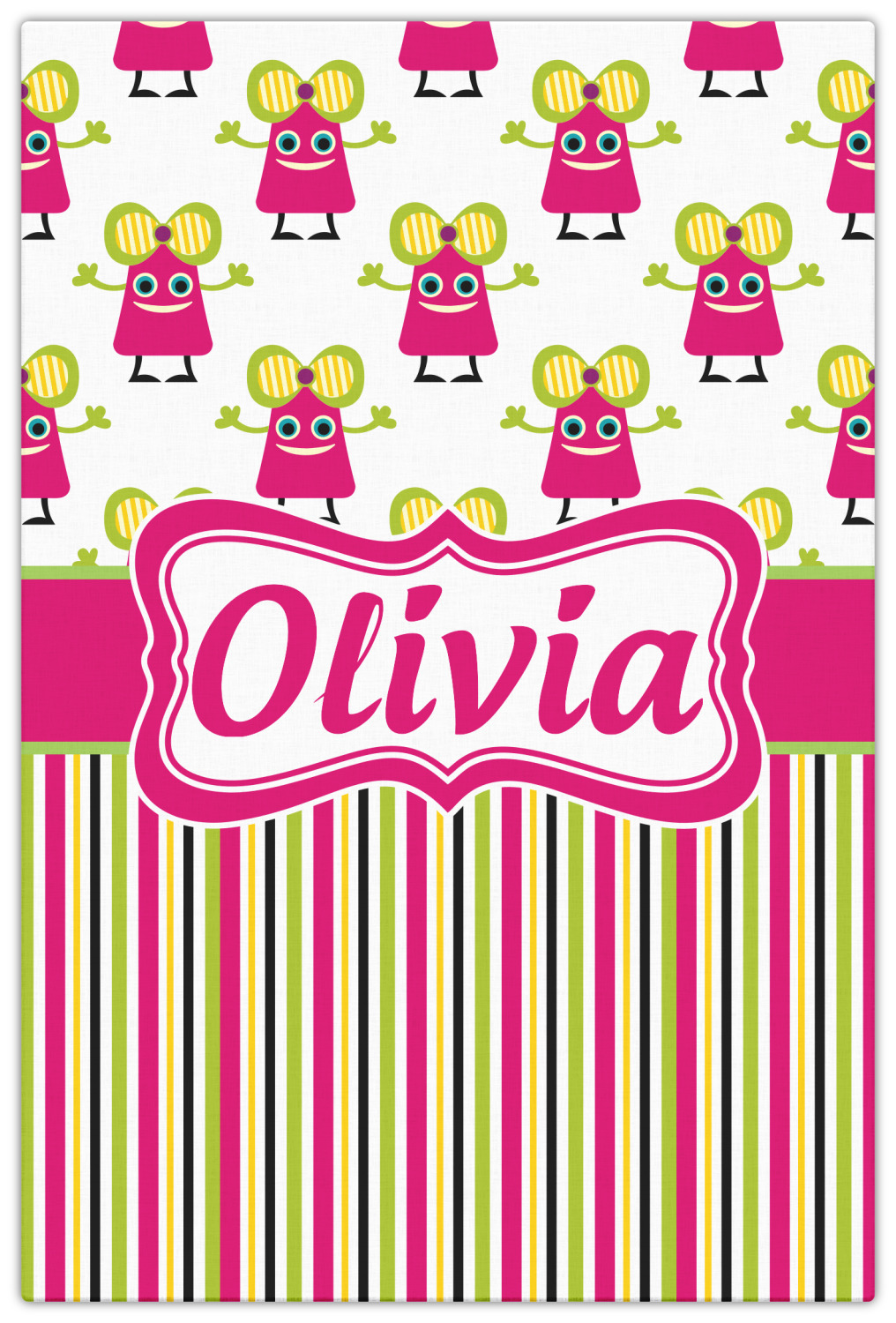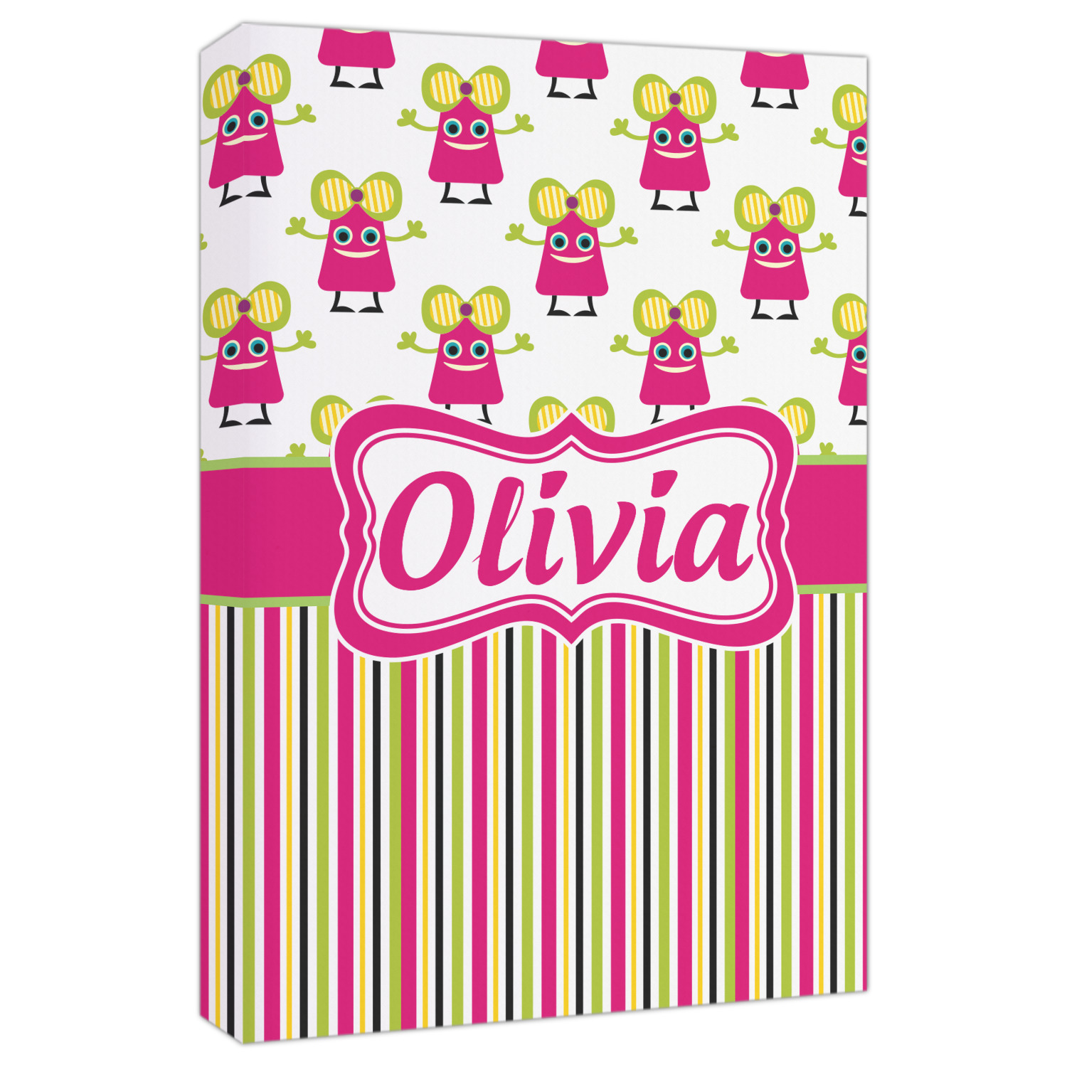 Not all little monsters have to be scary. Our one of kind girly girl monster pattern will sure to delight your little one. This little hot pink monster is decorated with a huge green, yellow, and purple bow. Set on a white background she is just begging for a hug. A classic candy striped pattern below using coordinating colors brings this design together. A wide hot pink band trimmed in lime green adds a designer touch.